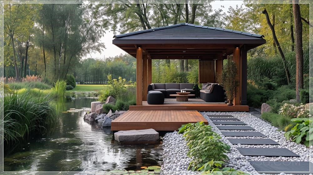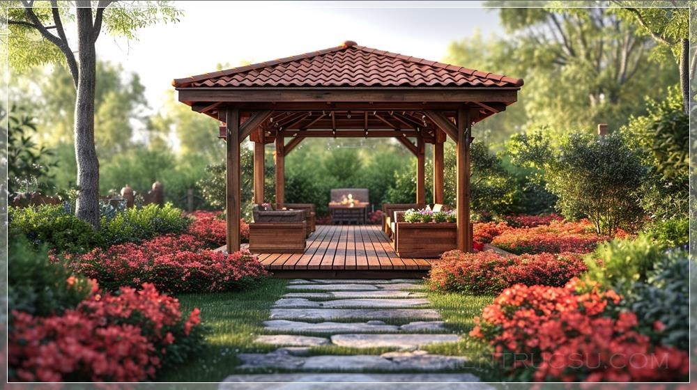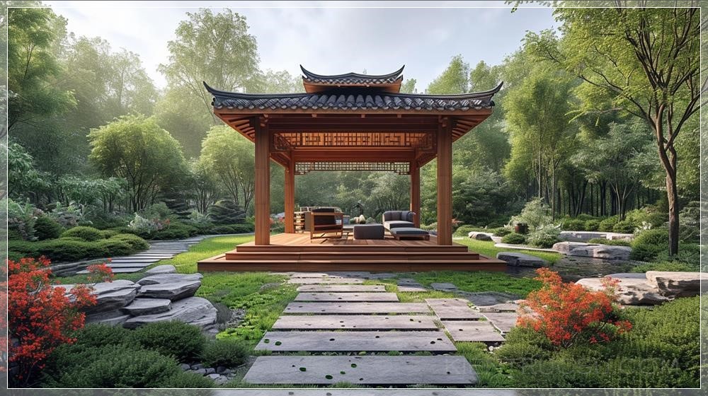 PROMPT: gazebo with a half a meter plinth hight for a farm house, modern rectangular gazebo on a plinth --ar 16:9 --s 750 --v 6.0