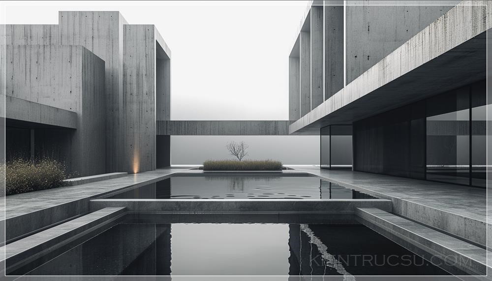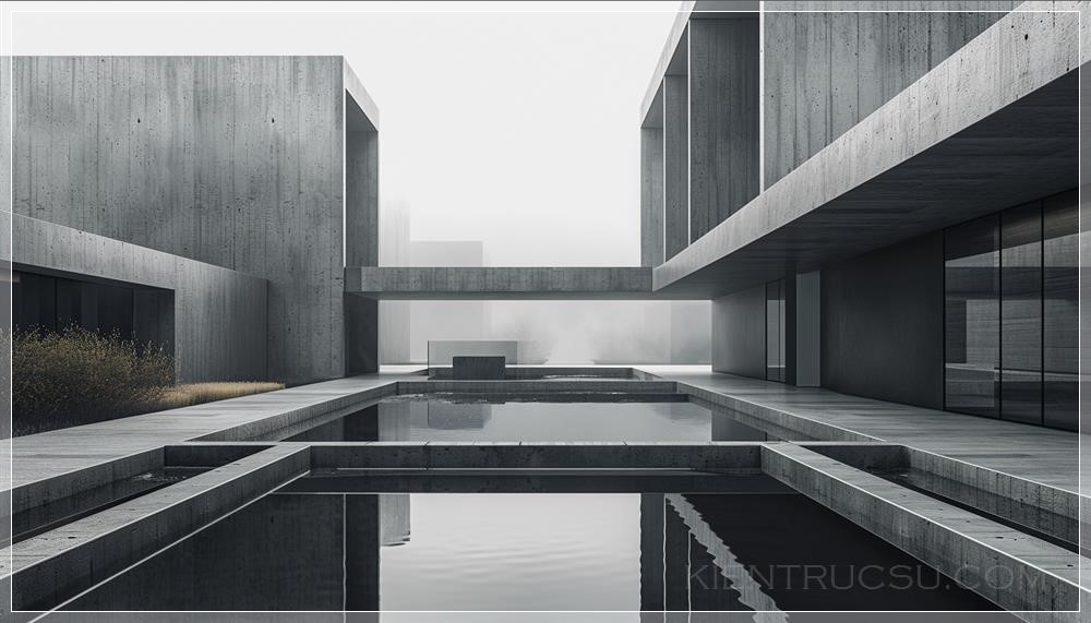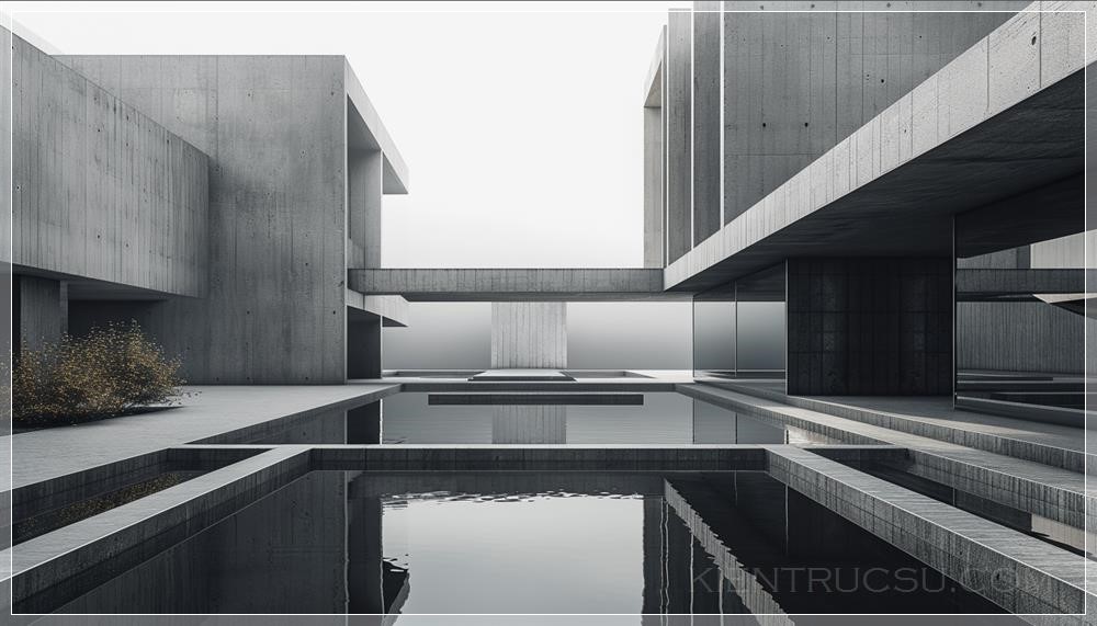A realistic landscape photo shot from the ground level of a simple liminal brutalist building's entrance with still water in a rectangular pond, a clear sky, and grey concrete construction. No shrubery, no clutter, very simple geometric design. Very liminal feeling. --aspect 7:4 --v 6.0
