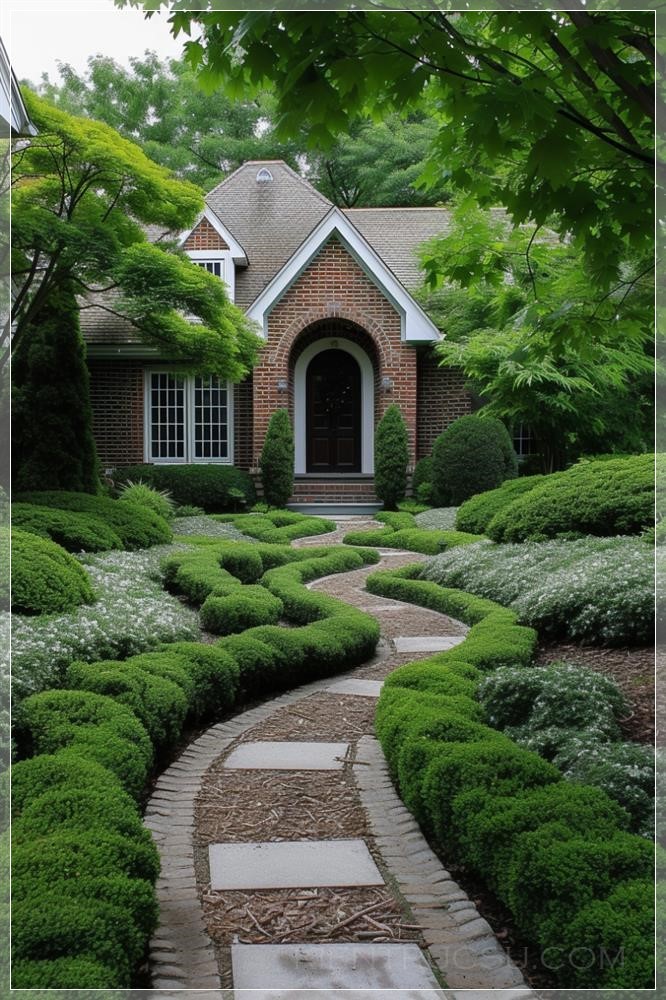residential landscape services include landscape design, mowing, edging, planting, and pruning to keep your lawn beautiful all year long, in the style of uhd image, light white and light amber, twisted branches, mid-century, arched doorways, light green and white, detailed nature depictions --ar 400:597 --v 6.0 --iw 2