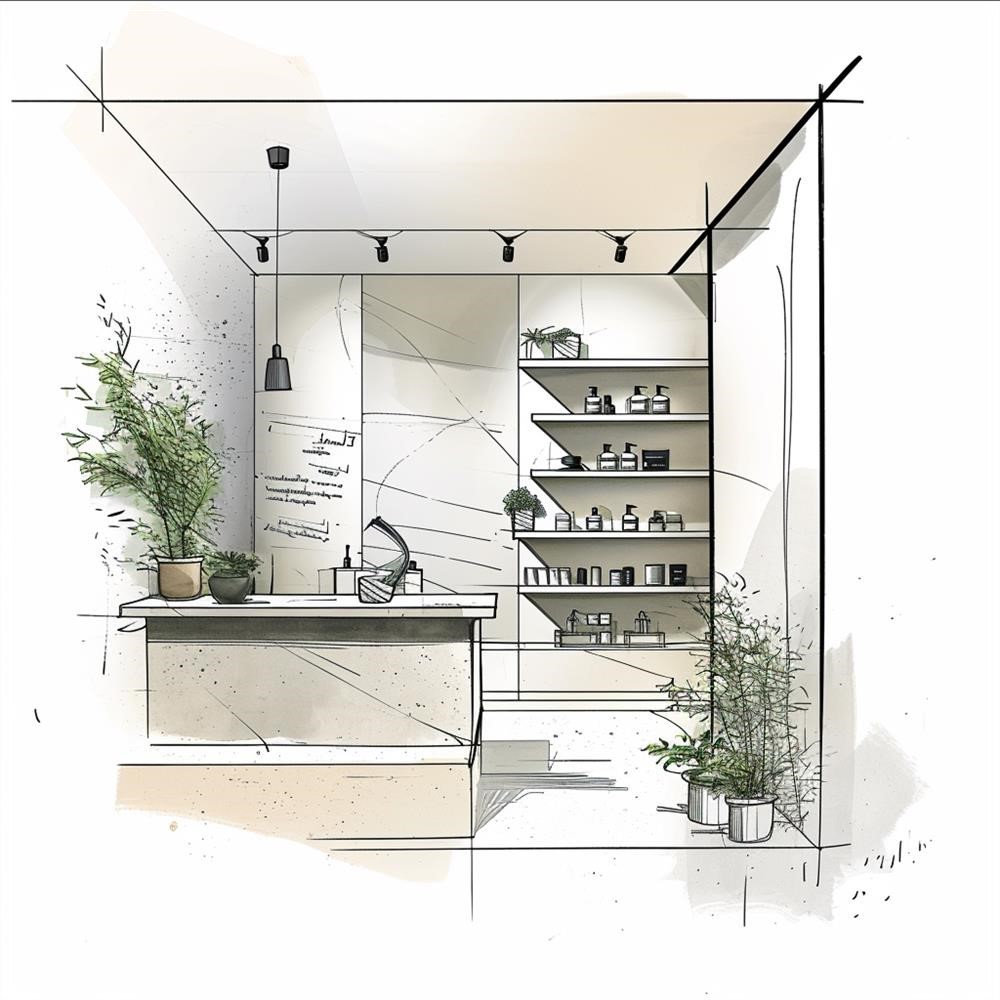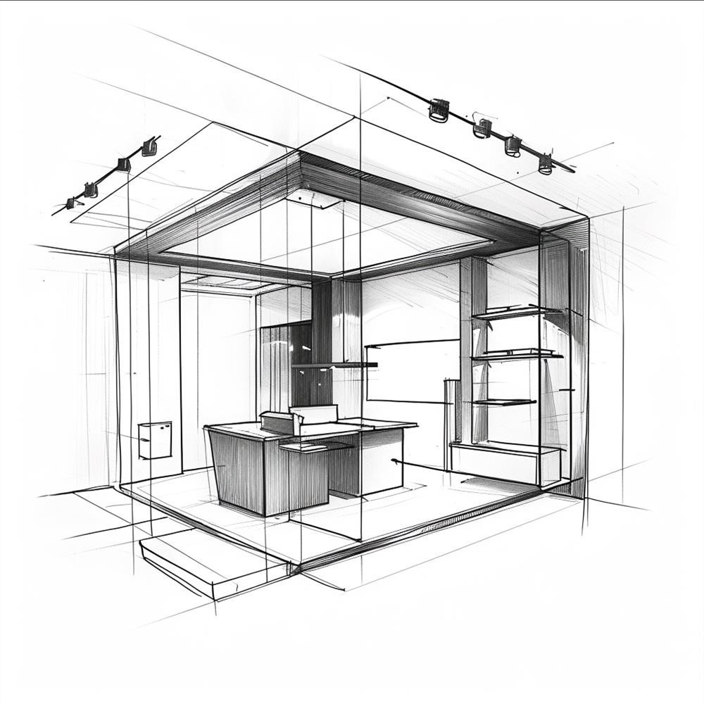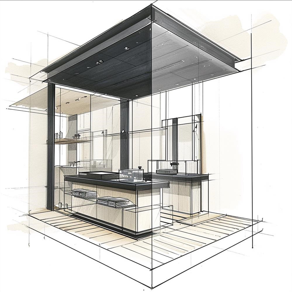 PROMPT: technical drawings for a modern pop up store, sketches style with measurements, design, architecture style, minimal, luxury cosmetics --style raw --v 6.0 Ý Nghĩa: