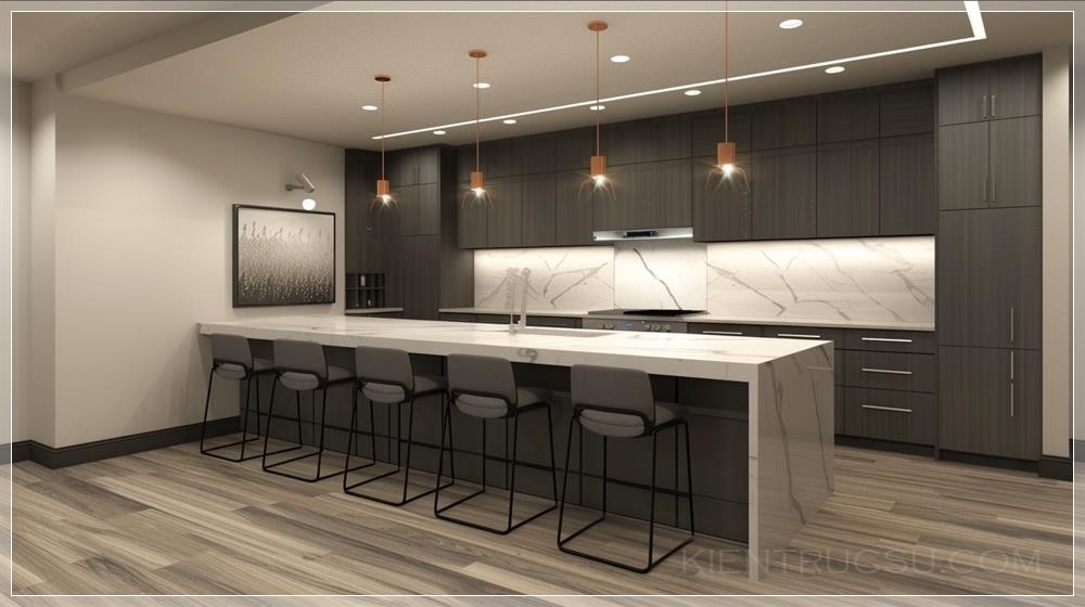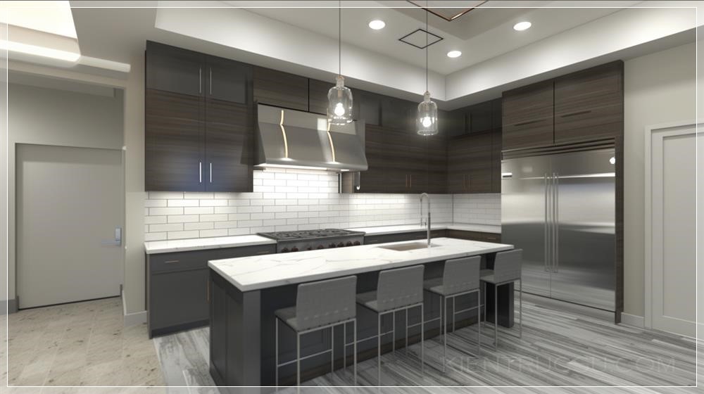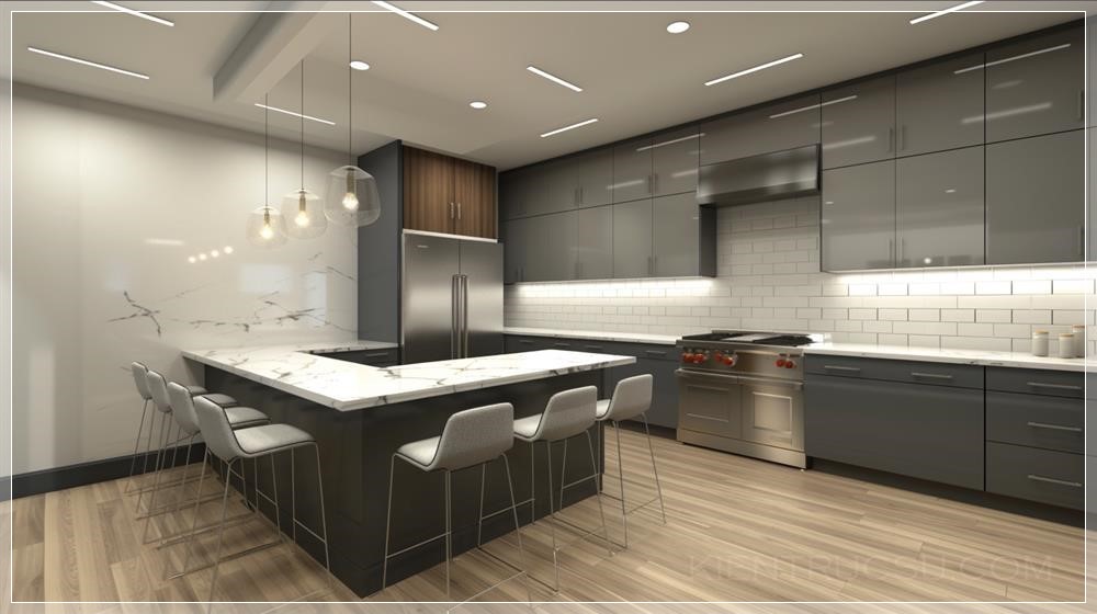 modern office breakroom with no island, no range/oven, charcoal wood base cabinets, white marble countertop, with 50% medium grey upper cabinets with no upper soffits. white subway tile backsplash, recessed lighting under upper cabinets. --ar 16:9 --v 6.0