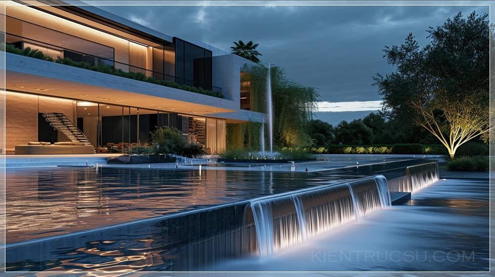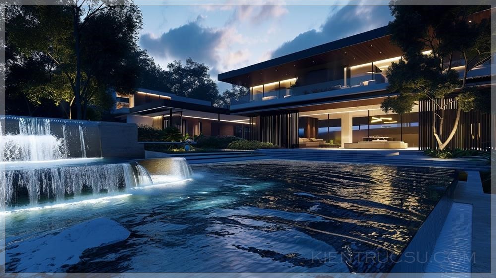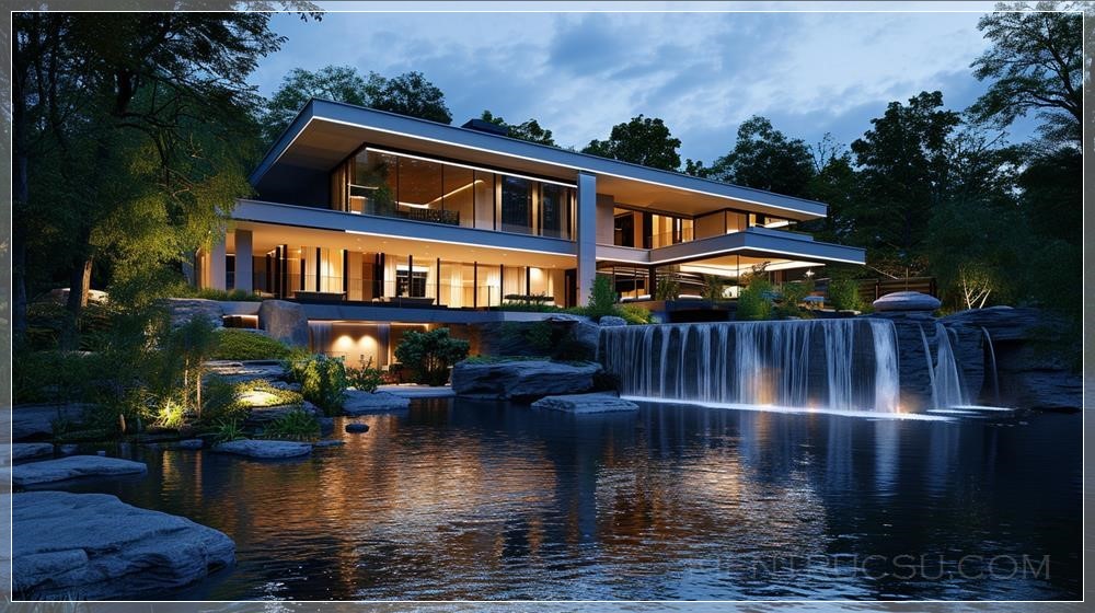 A grand modern house with elegant water features, minimalist fountains, cascading waterfalls, creating auditory privacy and luxury, strategic evening lighting in the garden. Created Using: modern architecture, luxury water elements, natural sound barriers, artistic lighting, tranquil environment, high-definition rendering, photorealistic style, vivid colors --ar 16:9 --v 6.0