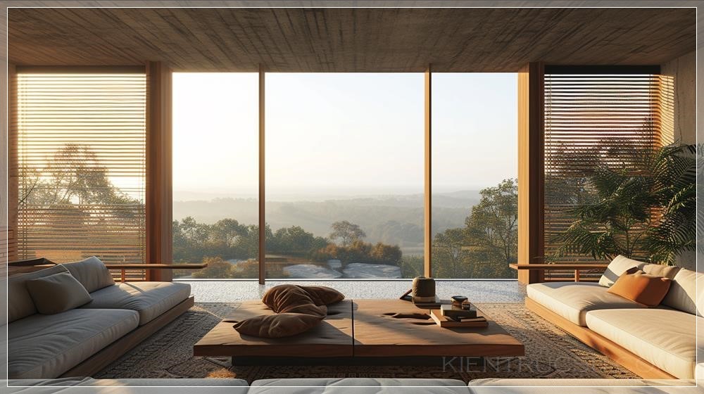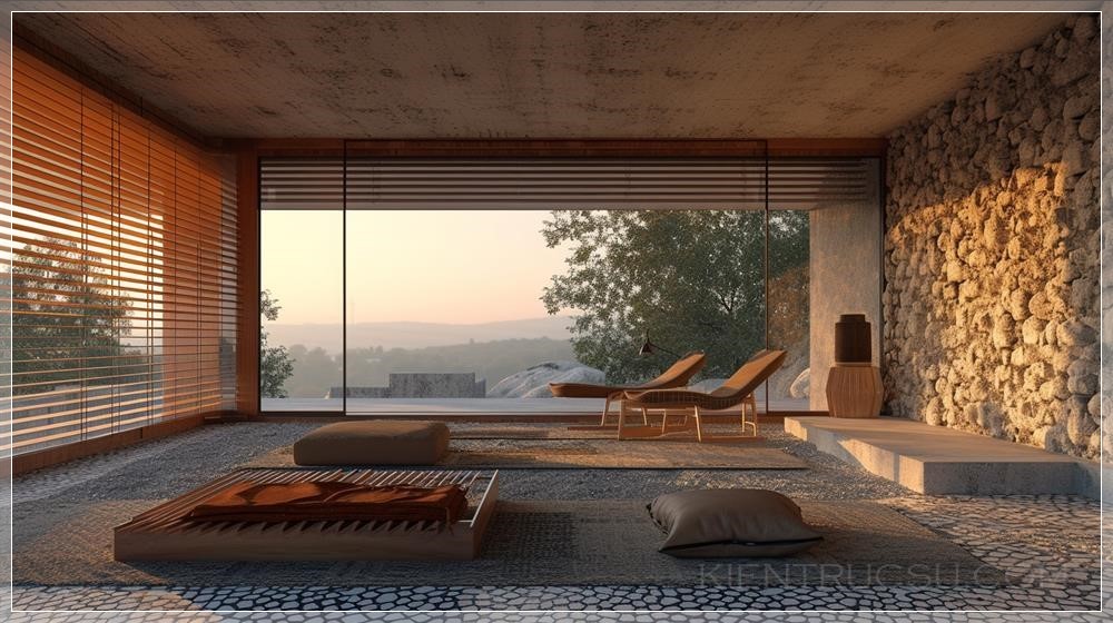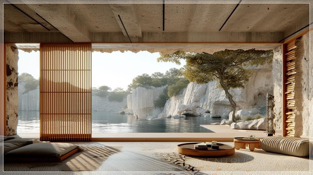 A cozy Mediterranean living room situated on the side of a quarry, with a large window offering a breathtaking view of the landscape. The room exudes warm tones and embraces the concept of wabi-sabi, with a concrete ceiling and a mosaic floor. The window features wooden frames and elegant Venetian blinds that let in the natural light during the golden hours of the day. The image should be captured in a horizontal orientation, utilizing architectural photography techniques and a 24 mm lens. --s 150 --ar 16:9 --c 5 --v 6.0