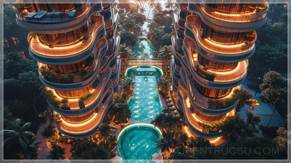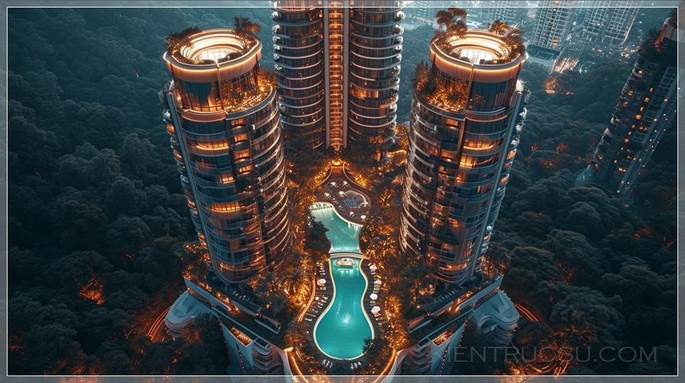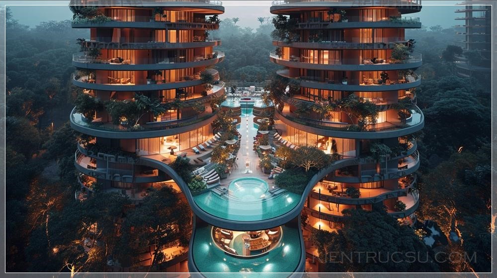 Symmetrical composition showing the entire building ground to roof, 45-degree angle aerial view, ultra-contemporary style, creative design, 2 hotel towers with 1 high floor glass bottom pool connecting the towers, balconies, earth tone color palette, natural lighting, mid day, dramatic lighting, --ar 16:9 --s 250 --v 6.0