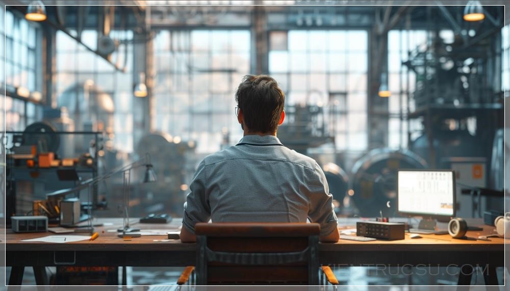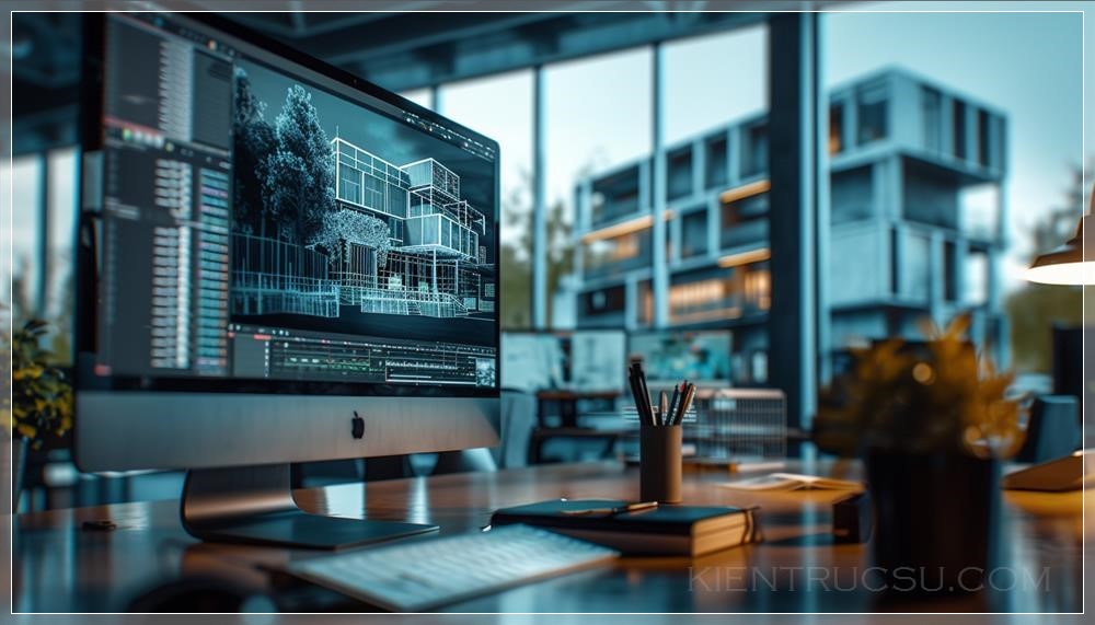architect making scene on your pc 3d, wire scene, windows view Bata factory area in Zlin 2023, in front of this scene is same scene in visualization, back from camera, cinematic style of robert zemeckis, strong element, shallow depth of field --s 200 --v 6.0 --style raw --ar 7:4