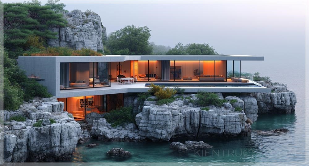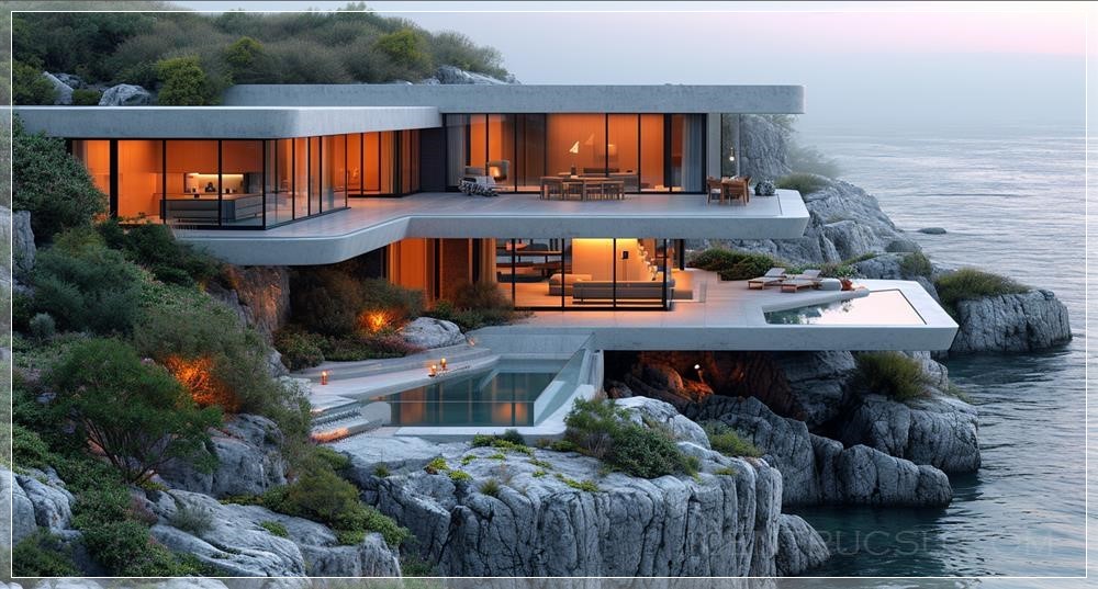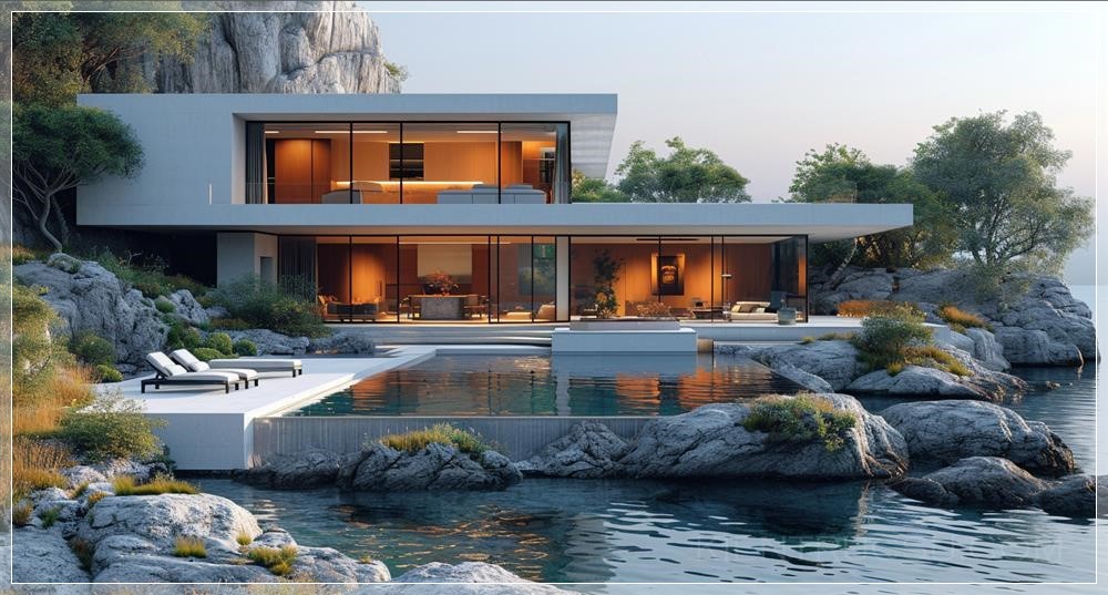 stunning contemporary single story house, 6000sqft, frank lloyd wright, iron man style, surrounded by sea, white, lot's a glass, perched on rocky outcrop in skandinavia, hyper realistic, v-ray, crisp daytime, blue skies - 4k --ar 128:69 --s 750 --v 6.0