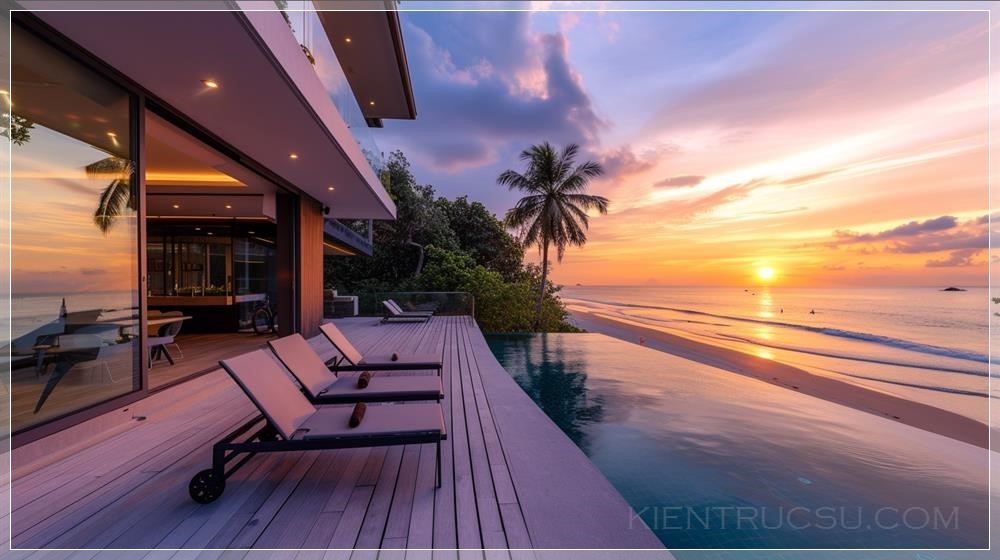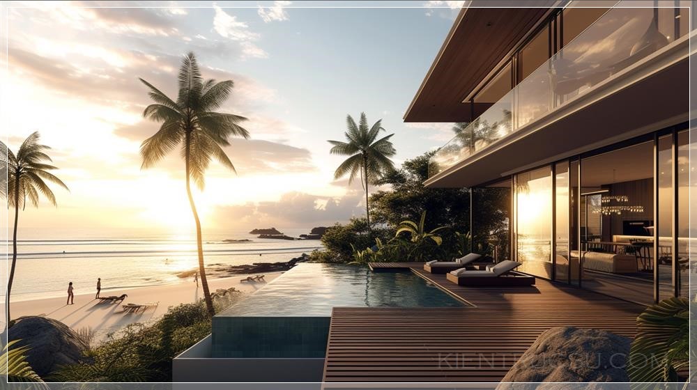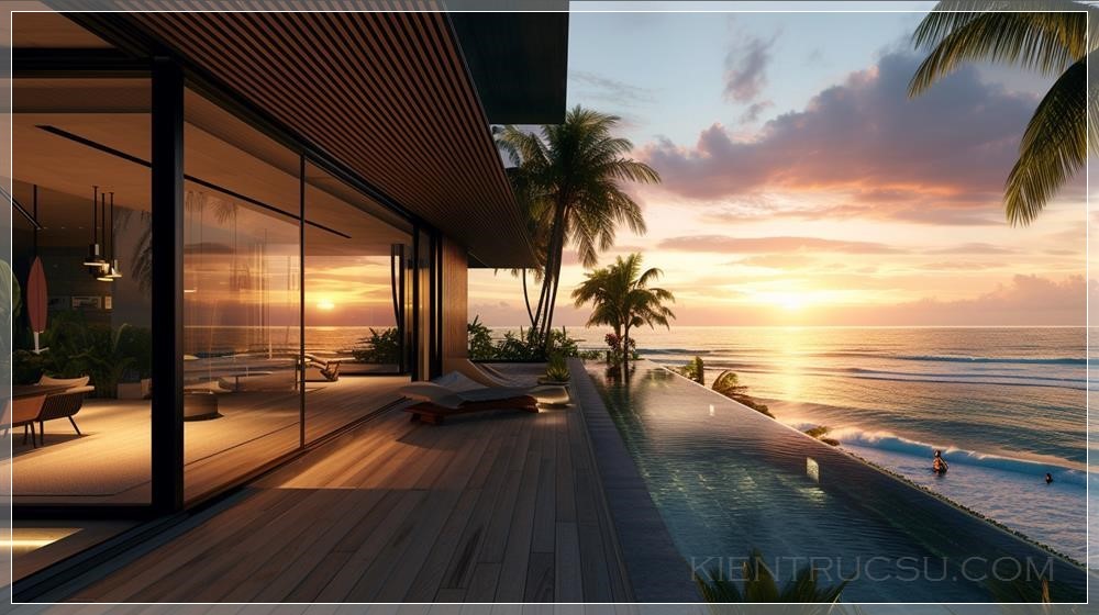 A modern villa's balcony exterior, consistent with the villa's sleek style, featuring a luxurious pool and a wooden deck. The balcony overlooks a secluded tropical beach with surfers in the ocean, all under the warm glow of a sunset. The composition is an outside view, focusing on the balcony's design and its stunning panoramic view of the beach and ocean. The scene is captured as if through a 50mm lens, embracing the natural perspective and the serene sunset lighting. --style raw --ar 16:9 --v 6.0