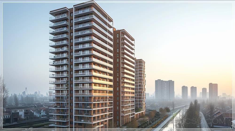 Ultra realistic photo of a appartement tower in a Europe city. The building has 350 apartments. Photo is taken with daylight and shot from far. Camera that is used is a canon Eos mark VI with wide angle lens. Styling of the tower is modern, clean and high end. Long Shot, Shot with Canon Eos mark camera, 4k resolution --no people --style raw --v 6.0 --ar 16:9 --s 750