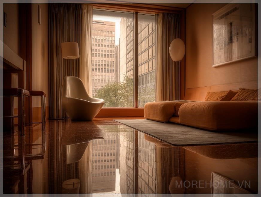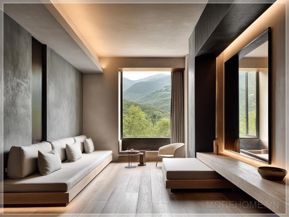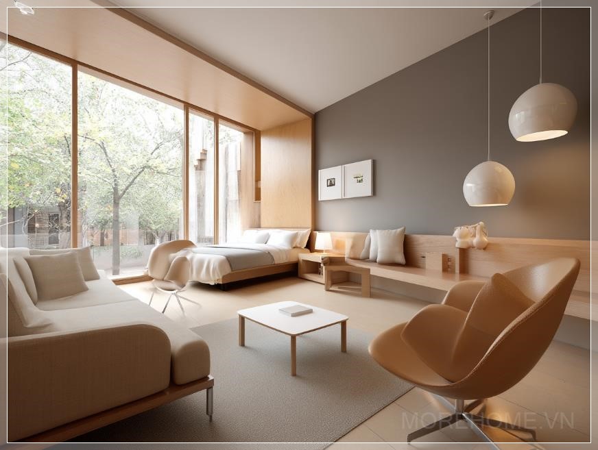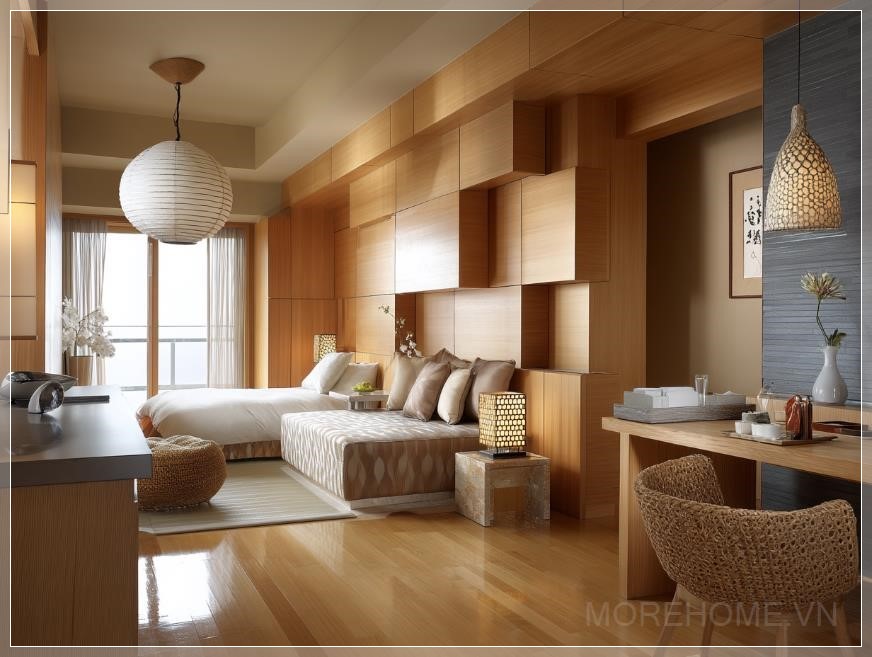 Phòng ngủ này thể hiện rõ phong cách tối giản Nhật Bản, với thiết kế đơn giản nhưng thanh thoát, tạo nên một không gian thư giãn và yên bình. Nội thất bao gồm một chiếc sofa tinh tế và ghế nhẹ, mang lại sự thoải mái tối đa mà không làm mất đi sự tinh giản của không gian. Cửa sổ lớn mở ra một tầm nhìn rộng lớn, đón ánh sáng tự nhiên, làm cho phòng trở nên sáng sủa và thoáng đãng.