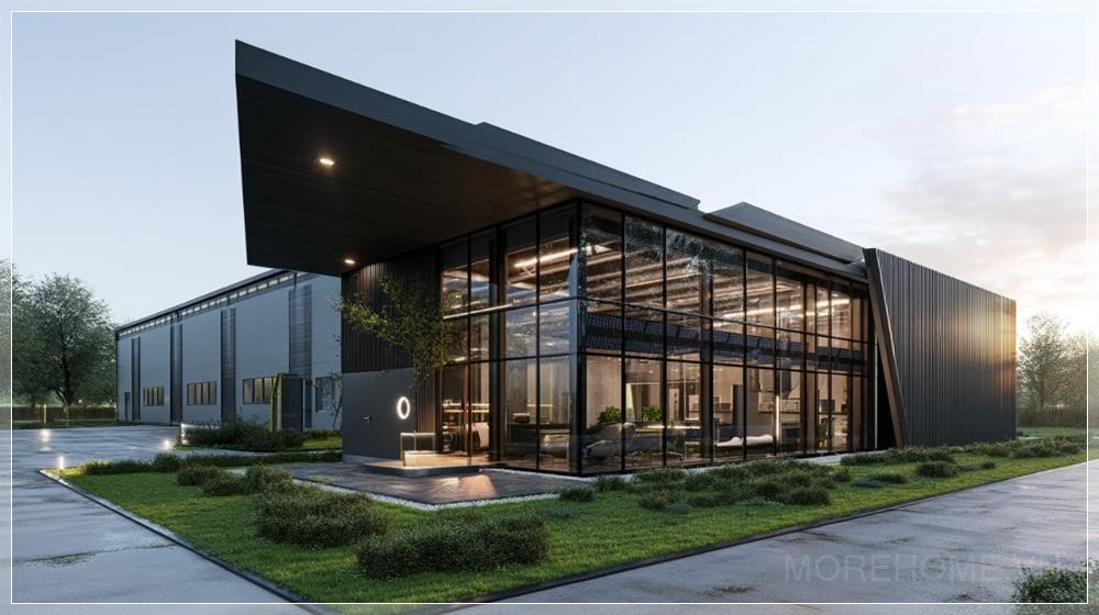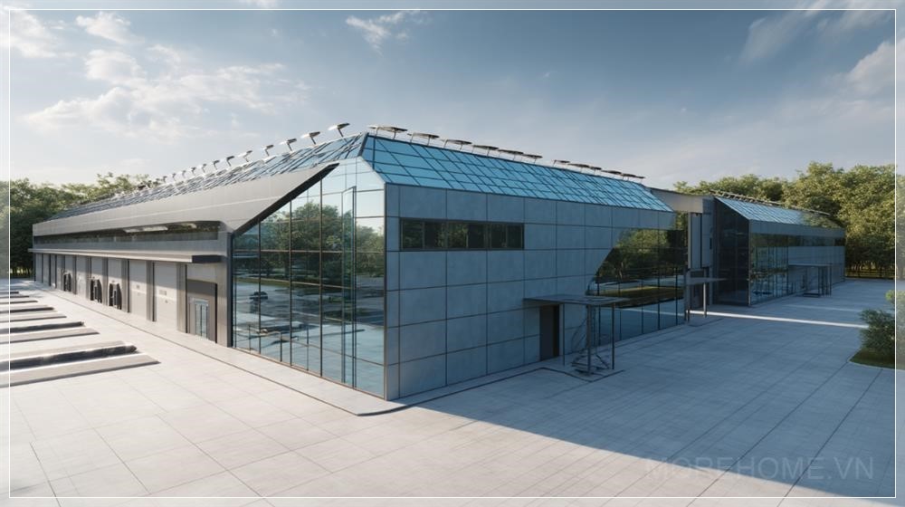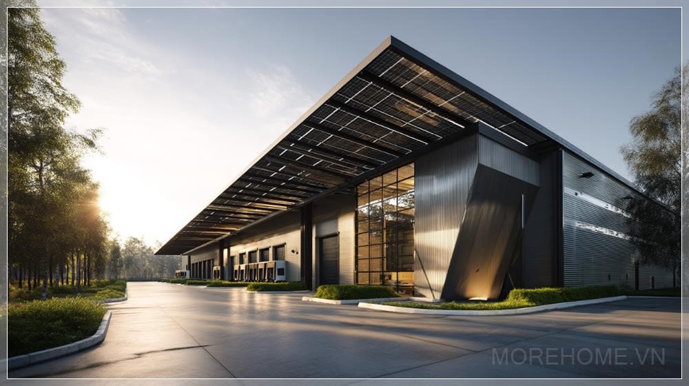 Mặc dù mang đậm phong cách công nghiệp, nhưng không gian vẫn duy trì tính thân thiện với môi trường, với các yếu tố thiết kế sạch sẽ và tối giản. Cây xanh xung quanh làm tăng tính thẩm mỹ và tạo ra một không gian làm việc dễ chịu và gần gũi với thiên nhiên. Ánh sáng điện ảnh với kỹ thuật chiếu sáng chuyên nghiệp làm nổi bật từng chi tiết của kiến trúc, tạo nên một bức tranh sống động và thực tế, phản ánh xu hướng thiết kế kho vận bền vững trong tương lai.