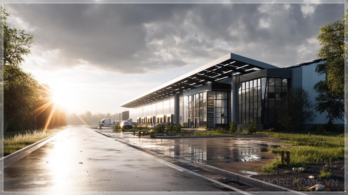 **Kho vận siêu hiện đại và bền vững với các tấm pin mặt trời trên mái, đường nét kiến trúc tinh tế, cửa sổ kính lớn, môi trường công nghiệp nhưng thân thiện với môi trường, thiết kế sạch sẽ, không gian ánh sáng ban ngày, xung quanh là cây xanh, phong cách tương lai, ánh sáng điện ảnh chuyên nghiệp, phong cách thực tế.**