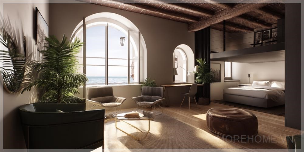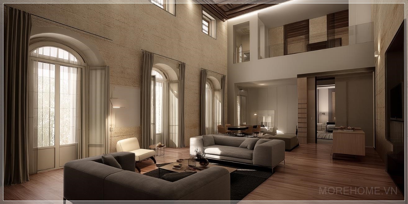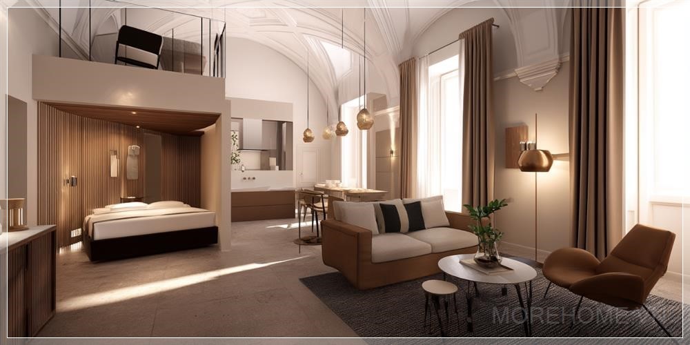 Spanning 60-70 square meters, this beautifully designed suite boasts a high ceiling of 5 meters, allowing for a spacious and airy atmosphere. The mezzanine, covering an additional 15 square meters, offers an elevated view of the main room, making it a perfect place for relaxation or work. The intricate blend of classical architecture with modern details provides a unique and inviting ambiance that reflects the rich heritage of the region.