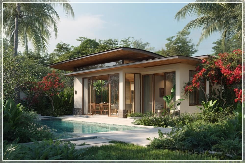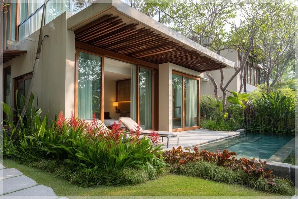 Ảnh chân thực của một biệt thự nhiệt đới hiện đại tại Phuket, kiến trúc thấp tầng với thiết kế tối giản, mặt tiền màu be sáng, cửa kính trượt, các yếu tố mái bằng gỗ, hồ bơi riêng phía trước, bao quanh bởi cây cối xanh tươi và những hoa nhiệt đới đỏ, bảng màu nhẹ nhàng, các tông màu tự nhiên đã được làm dịu, khu vườn yên bình với cỏ cắt gọn, ánh sáng buổi sáng sớm, nhìn từ mức độ mặt đất. Chất lượng cao, siêu thực tế HD.