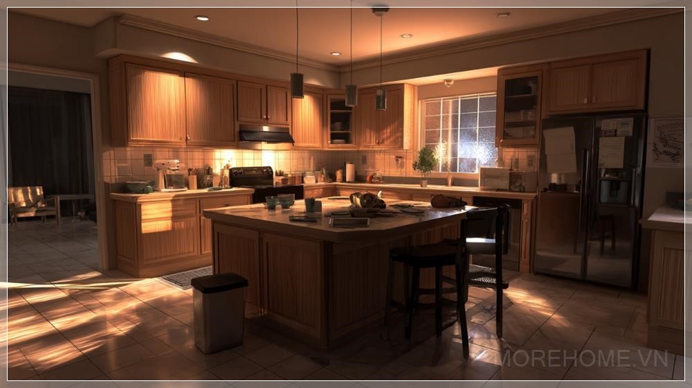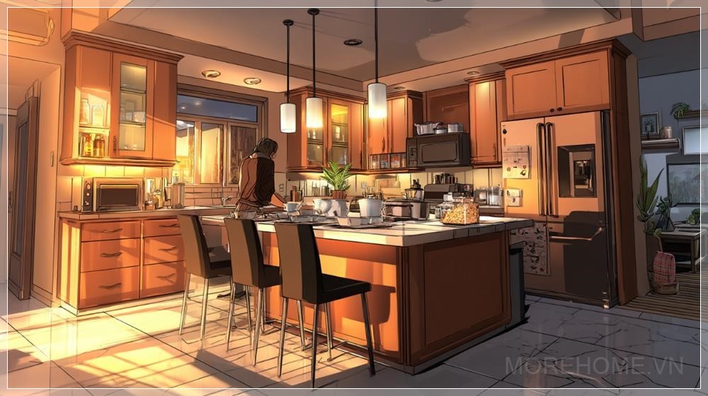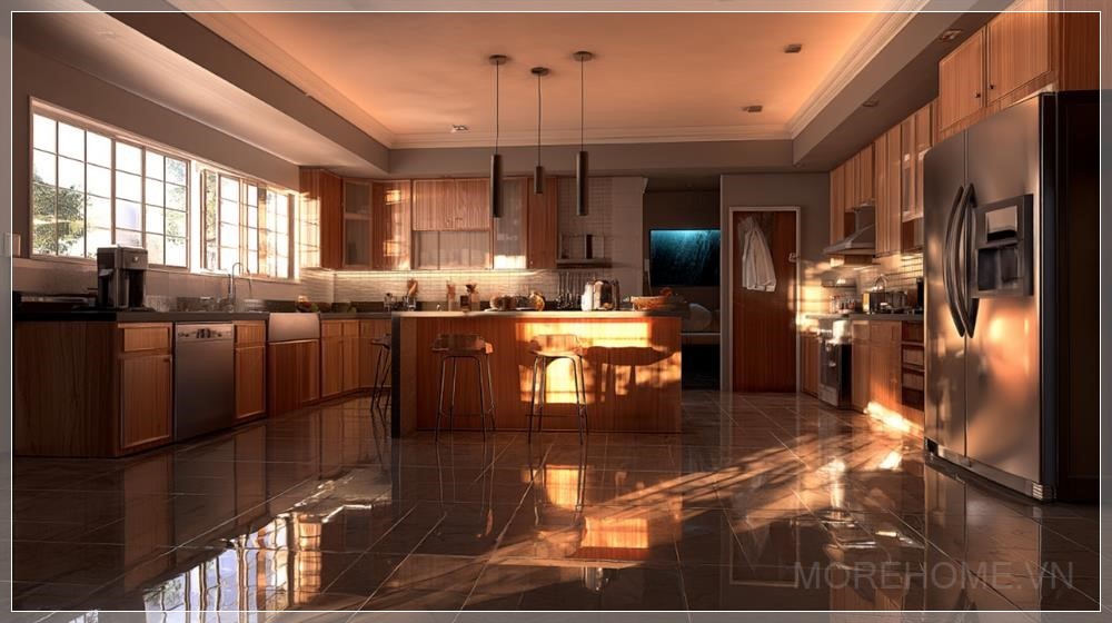 Một không gian bếp gia đình hiện đại với thiết kế thực tế, bao gồm các tủ gỗ ấm áp, sàn gạch lát tinh tế và ánh sáng nhẹ nhàng tạo cảm giác ấm cúng. Trung tâm của bếp là một đảo bếp hoặc mặt bàn rộng, mang đến sự tiện nghi và thẩm mỹ cho không gian. Bếp được giữ sạch sẽ nhưng vẫn có cảm giác gần gũi, tạo nên một không gian sống động, gắn kết, nơi mọi người có thể cảm nhận sự ấm áp và bình yên.