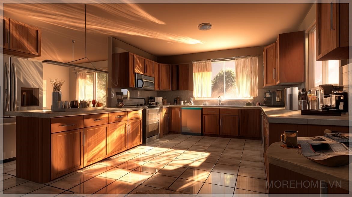 Bức tranh mang tính siêu thực với ánh sáng điện ảnh, sự ấm áp tự nhiên và cảm giác chân thực, làm nổi bật từng chi tiết của căn bếp.
