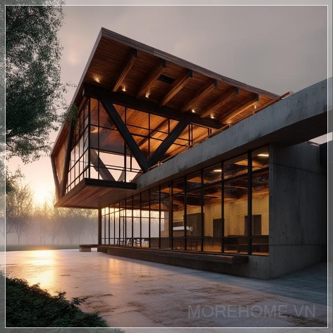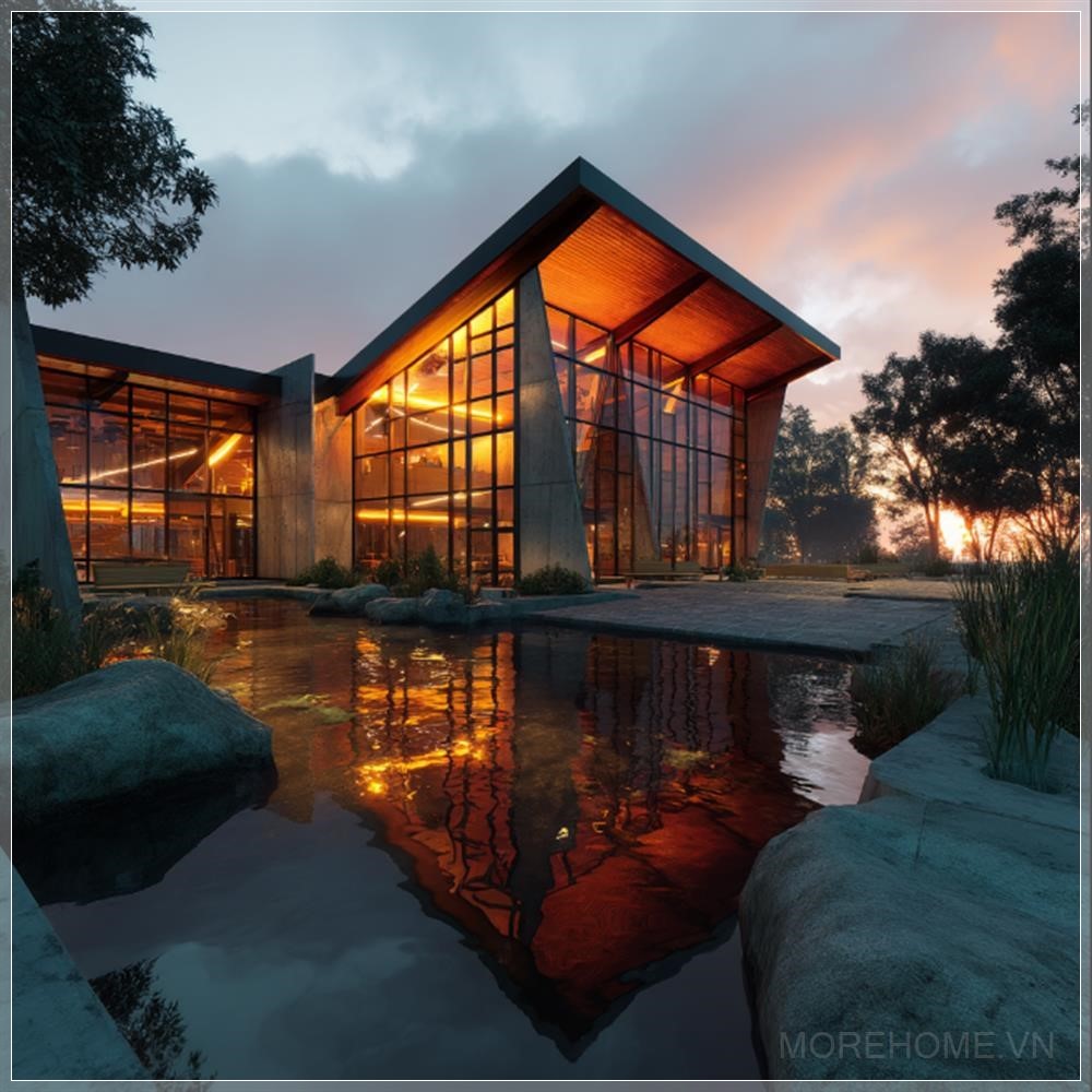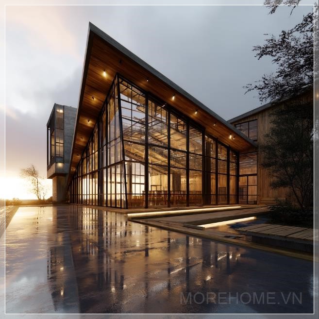 Một trung tâm giải trí với kiến trúc hiện đại, mang đến không gian ấm cúng và thoải mái. Thiết kế của tòa nhà sử dụng nhiều kính, gỗ và bê tông, tạo ra một sự kết hợp tinh tế giữa các vật liệu tự nhiên và công nghệ hiện đại. Các cửa sổ kính lớn cho phép ánh sáng tự nhiên tràn vào, làm cho không gian bên trong luôn sáng sủa và thoáng đãng.