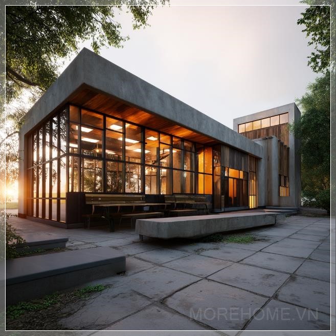 Bên ngoài tòa nhà là một công viên xanh tươi, nơi có cây cối và thảm cỏ, mang lại bầu không khí trong lành và dễ chịu. Vào lúc bình minh, ánh sáng ấm áp của mặt trời chiếu xuyên qua những tán cây, tạo ra một cảnh tượng tuyệt đẹp và đầy sức sống. Kiến trúc của trung tâm không chỉ chú trọng đến tính thẩm mỹ mà còn hướng đến sự tiện nghi và kết nối với thiên nhiên, mang lại một không gian lý tưởng để thư giãn và tận hưởng những khoảnh khắc yên bình.