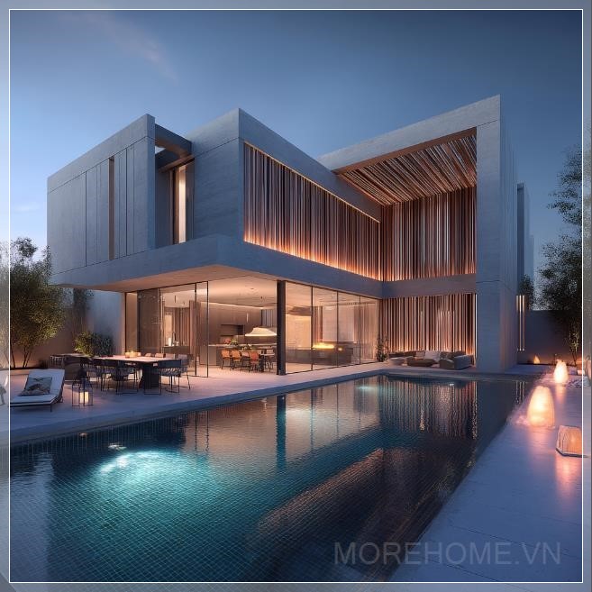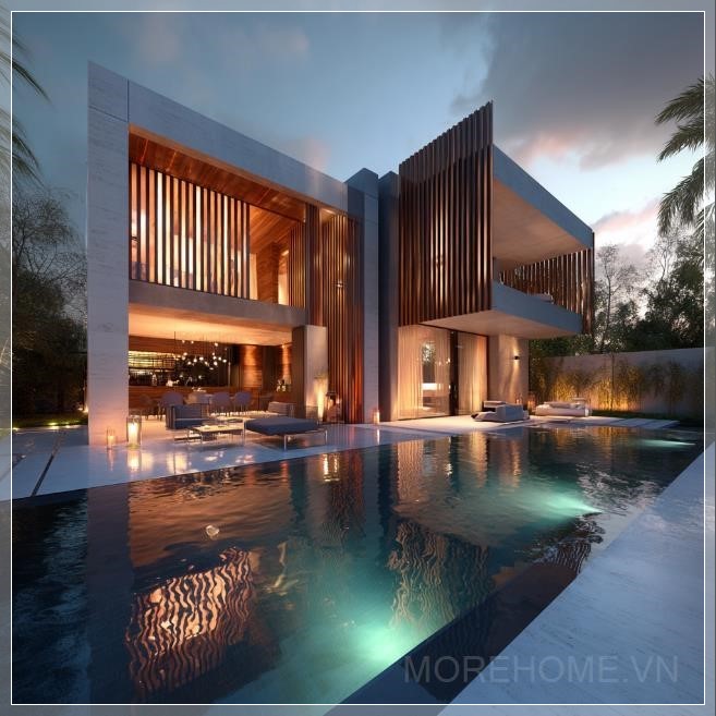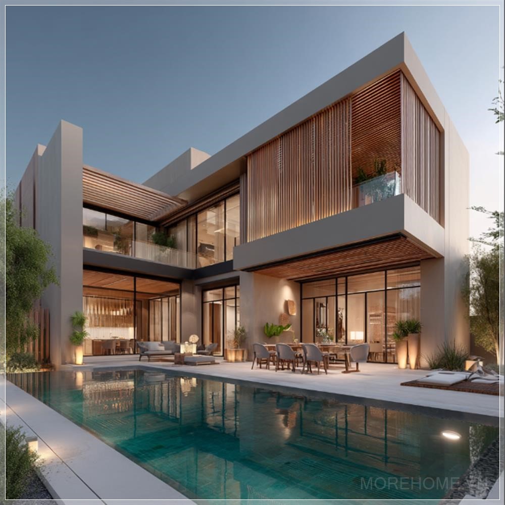 Một biệt thự hiện đại với hồ bơi, sân thượng và vườn xanh mướt tại Dubai, với hình dáng hình chữ nhật và các thanh gỗ trang trí trên mặt tiền, tạo nên vẻ đẹp tinh tế và sang trọng. Kiến trúc hiện đại và tối giản của ngôi nhà được thể hiện rõ qua các chi tiết đường nét sắc sảo, mang đến một không gian sống thoáng đãng và tiện nghi.