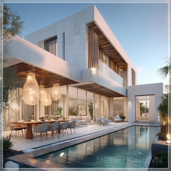 Bức ảnh ngoại thất mang đến cái nhìn tổng thể về kiến trúc ngôi nhà, với những chi tiết sắc nét và độ phân giải cao, thể hiện vẻ đẹp của kiến trúc tối giản hiện đại trong không gian đô thị Dubai. Từ hồ bơi đến khu vực ăn uống ngoài trời, tất cả đều tạo nên một không gian sống lý tưởng, sang trọng và hòa hợp với thiên nhiên.
