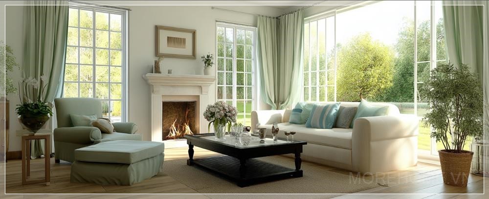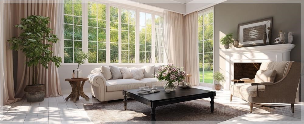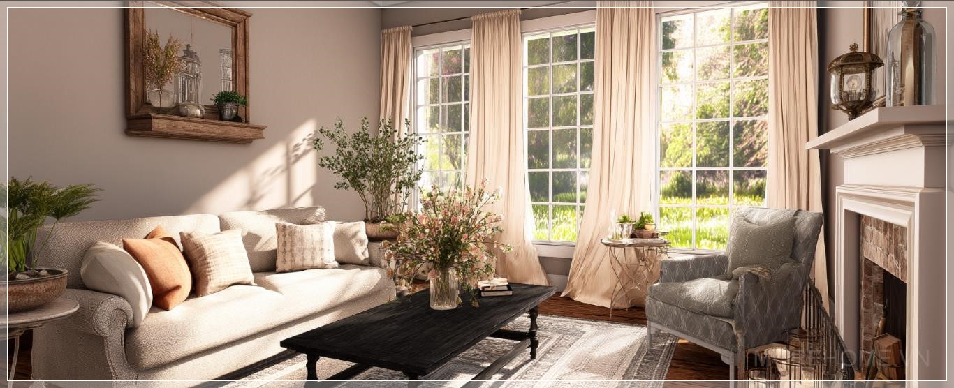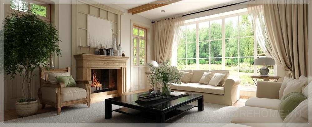 Phòng khách phong cách nông thôn, với lò sưởi thanh lịch, ánh sáng tự nhiên từ rèm voan, những chiếc ghế thoải mái, bên cạnh một chiếc bàn cà phê đen hình chữ nhật có đặt hoa trên đó. Cửa sổ phòng khách nhìn ra không gian xanh bên ngoài, tạo ra một bầu không khí yên bình. Một chiếc bàn phụ và một chậu cây được đặt ở một bên ghế sofa, thêm phần không khí nông thôn. Bàn cà phê đặc biệt nổi bật, với hiệu ứng render siêu thực tế, mang lại sự sống động và chi tiết cho không gian.
