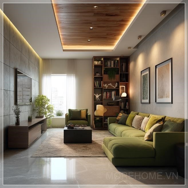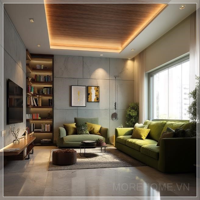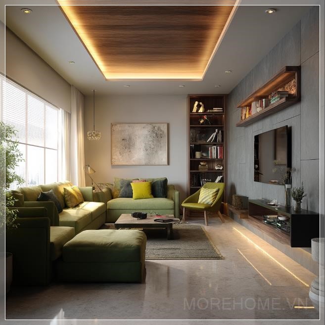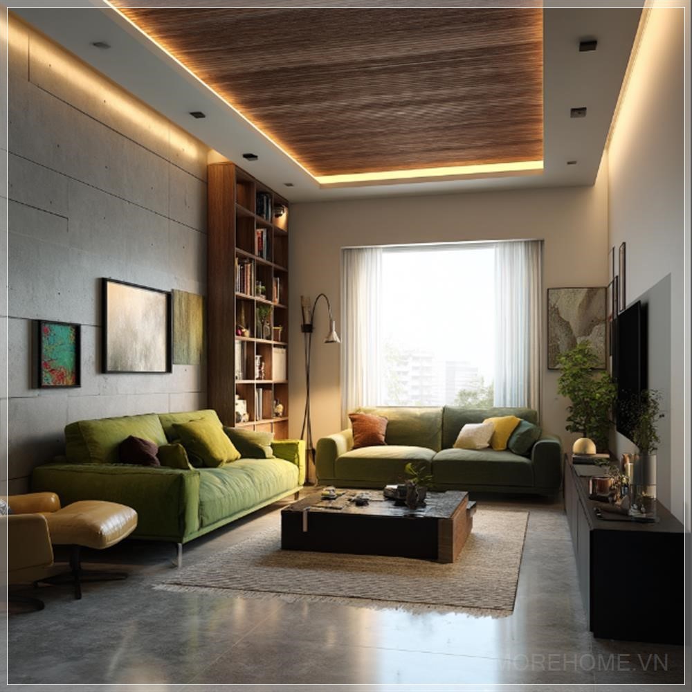 Tạo một phòng khách siêu thực tế trong một ngôi nhà tầng lớp trung lưu hấp dẫn với các điểm nhấn màu xanh lá đất. Phòng khách có một khu vực lõm trên trần nhà được trang bị dải đèn LED trắng ấm, tạo ra ánh sáng nhẹ nhàng và tinh tế. Không gian được bài trí với các màu sắc tự nhiên và những chi tiết nội thất đơn giản, mang lại cảm giác ấm cúng và thư giãn.
