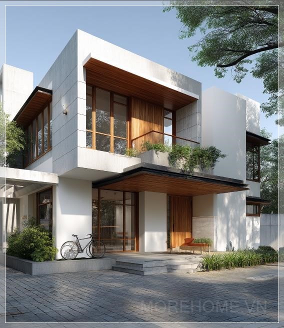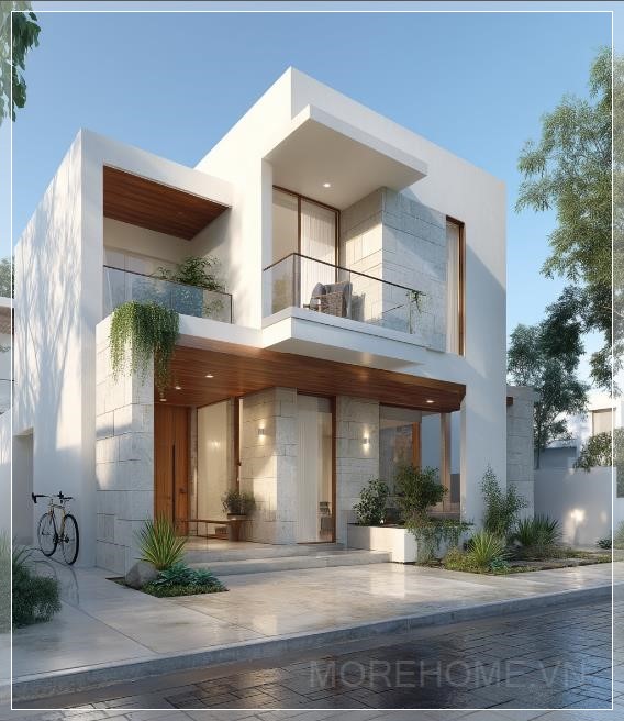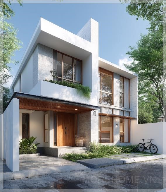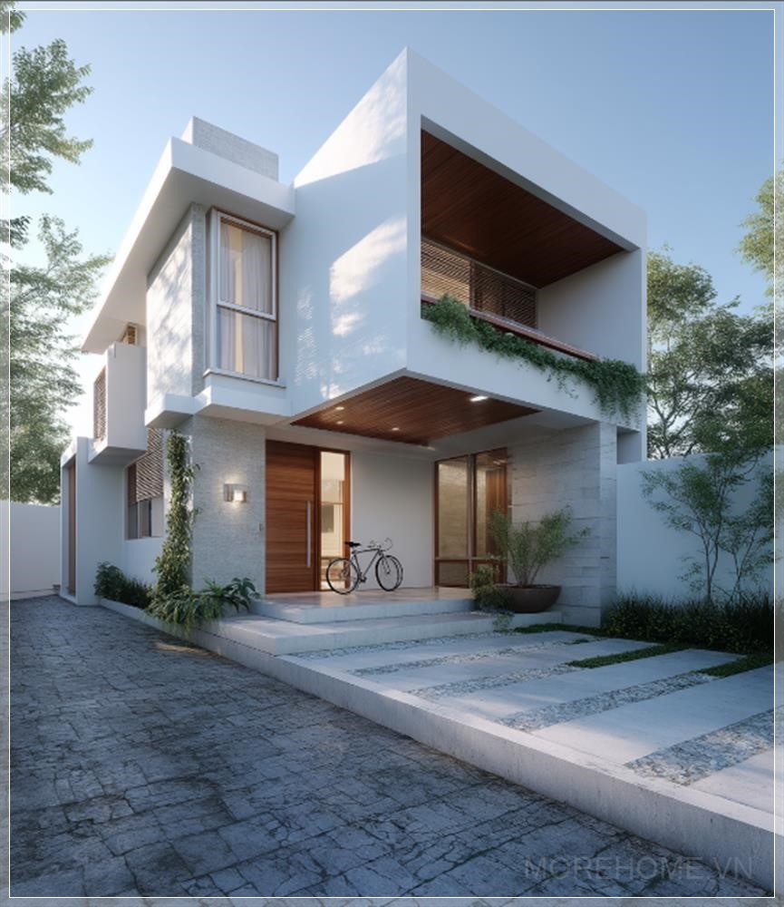 Mô phỏng 3D của một ngôi nhà hiện đại hai tầng với ban công, nhìn từ phía trước. Bảng màu của ngôi nhà kết hợp giữa màu trắng, xám và các chi tiết nhấn màu nâu. Phía sau là một không gian mở. Ở một góc, có một chiếc xe đạp được đậu. Khu vườn phía sau có cây xanh tươi tốt. Một hàng rào trắng góp phần tạo nên sự đơn giản cho không gian. Thiết kế này toát lên vẻ đẹp tối giản nhưng vẫn kết hợp các yếu tố tự nhiên, đồng thời có cửa kính tạo sự liên kết giữa không gian trong và ngoài.