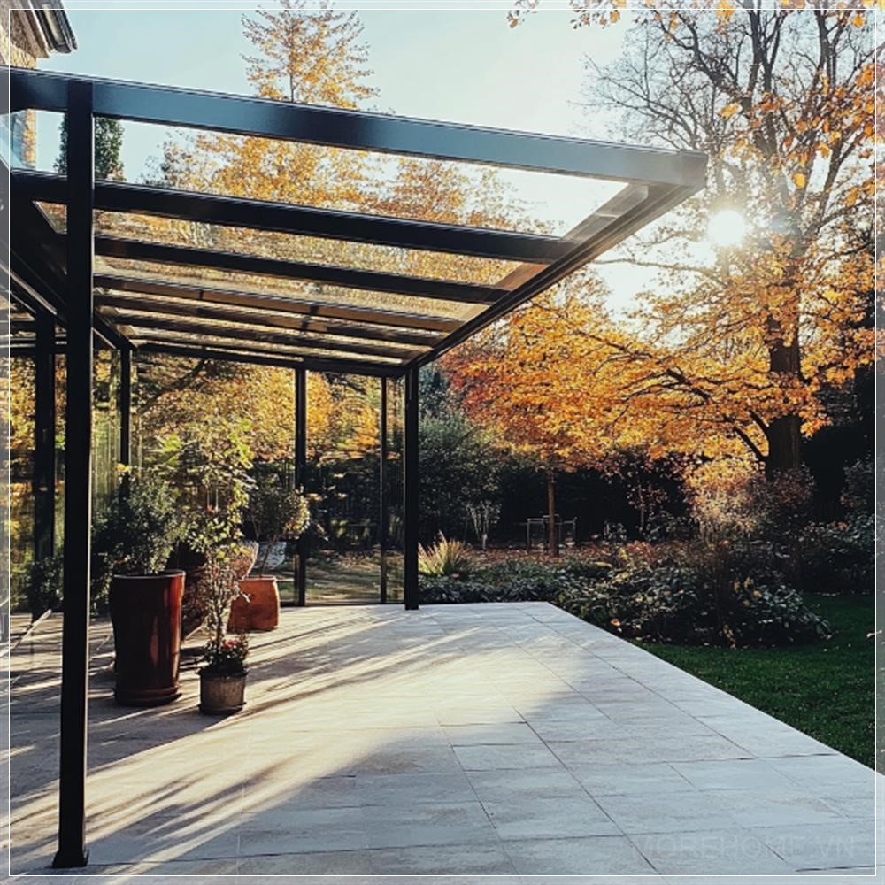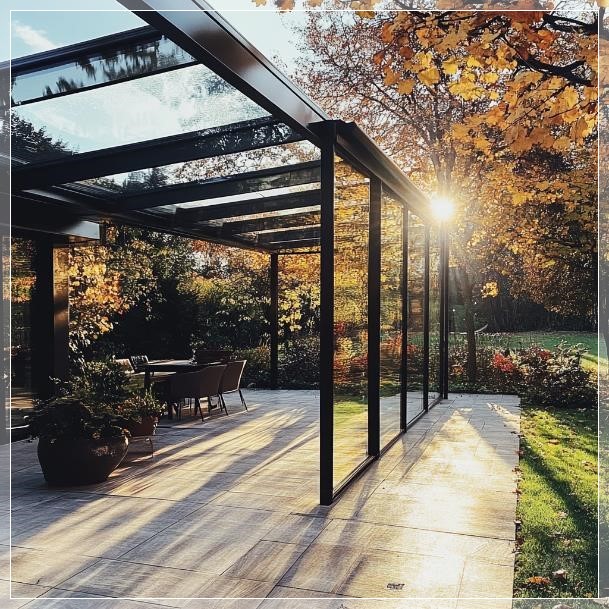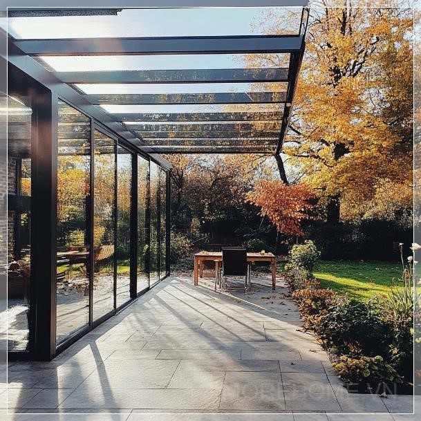 Một mái che bằng kính trong vườn vào sáng sớm mùa thu, dưới ánh nắng ấm áp, tạo nên bức ảnh phong cách sống lý tưởng cho Instagram. Không gian yên bình với những tia nắng chiếu qua mái kính, làm nổi bật khu vườn xanh tươi và không khí trong lành của mùa thu. Một khoảnh khắc thư giãn tuyệt vời để tận hưởng sự tĩnh lặng của thiên nhiên. #PhongCáchSống #MáiKính #VườnMùaThu #ThiênNhiên #InstagramVibes