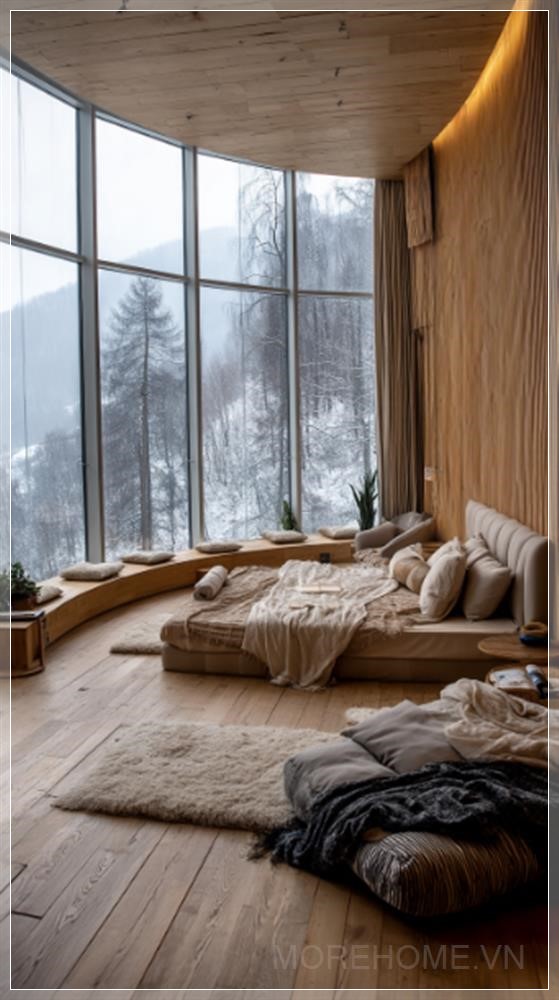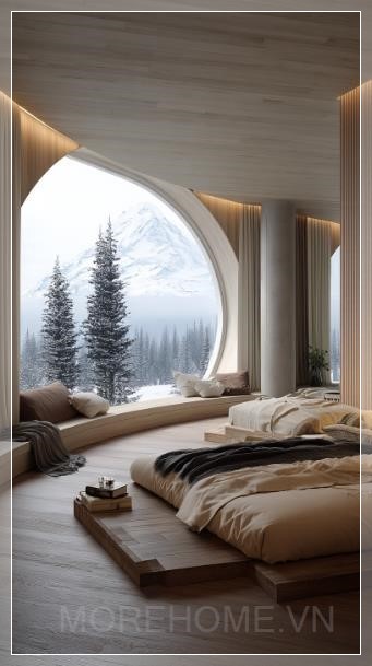 Không gian này mang lại cảm giác như một nơi trú ẩn yên tĩnh trong mùa đông, với cảnh vật tuyết trắng ngoài cửa sổ như một bức tranh sống động. Phòng ngủ không chỉ là nơi nghỉ ngơi, mà còn là một không gian tĩnh lặng, hoàn hảo để tận hưởng vẻ đẹp của thiên nhiên mùa đông.