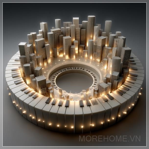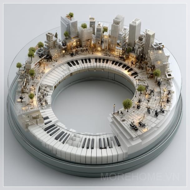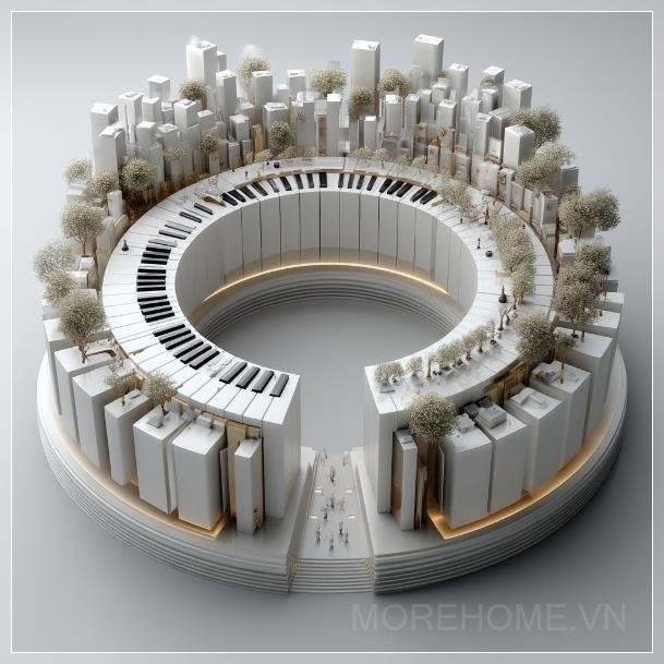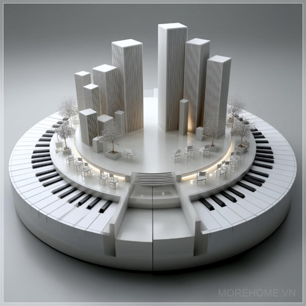 Một sân khấu màn hình sàn hình vòng tròn, bên trong vòng tròn là những phím đàn piano ba chiều và các tòa nhà đơn giản tạo thành một thành phố trừu tượng xếp lớp với kết cấu tinh thể.