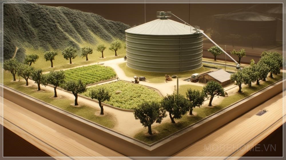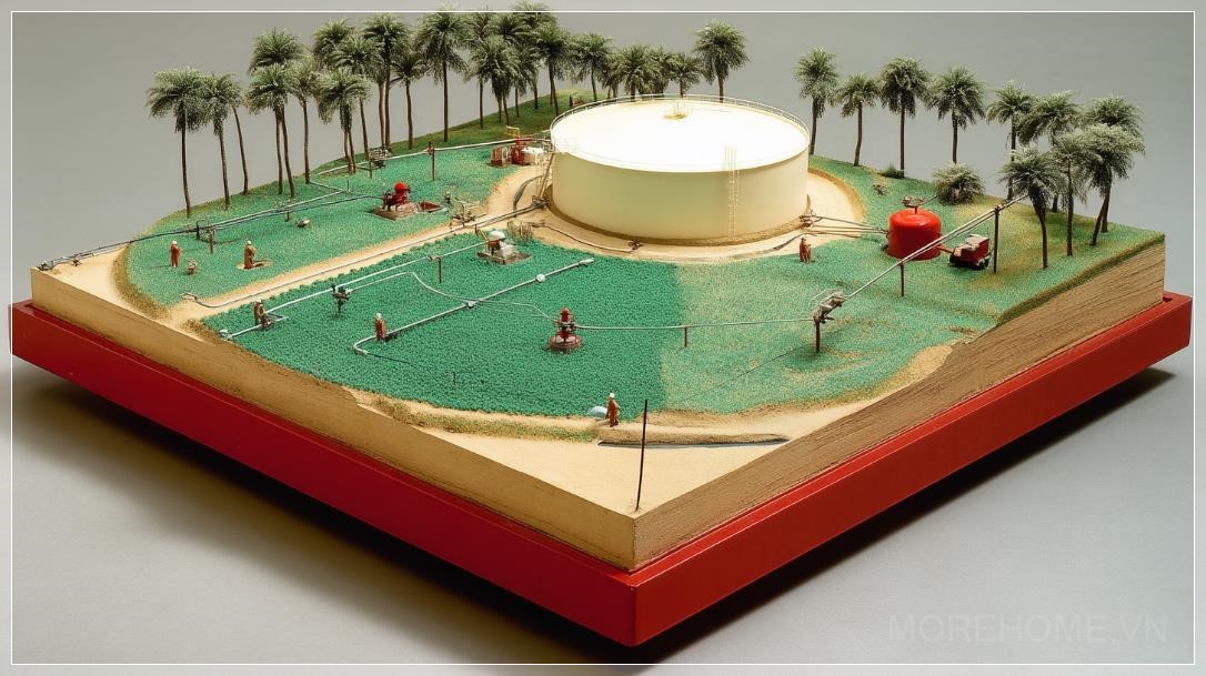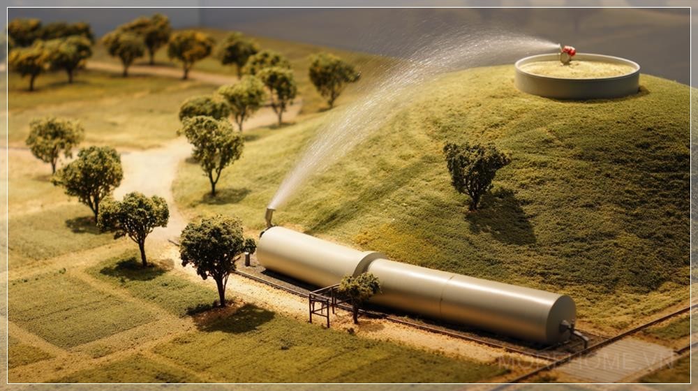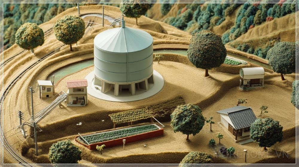 Mô hình bàn cát của hệ thống tưới tiêu nông trại, bao gồm một bể chứa nước lớn trên đỉnh đồi và hệ thống vòi phun nước trong khu đất canh tác dưới chân đồi, xung quanh là những cây xanh được trồng xung quanh khu vực đất canh tác. Mô hình được thiết kế theo phong cách của Kazumasa Nagai, với các chi tiết đơn giản nhưng tinh tế, kết hợp giữa yếu tố tự nhiên và cấu trúc kỹ thuật, tạo nên một cảnh quan nông nghiệp hài hòa và đầy tính thẩm mỹ.