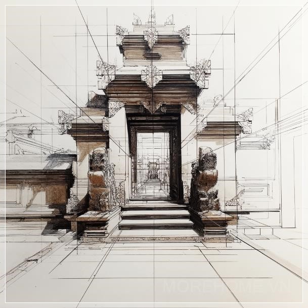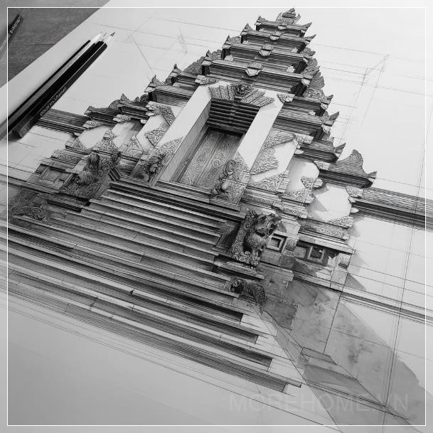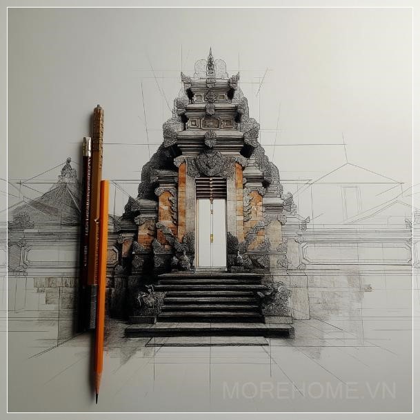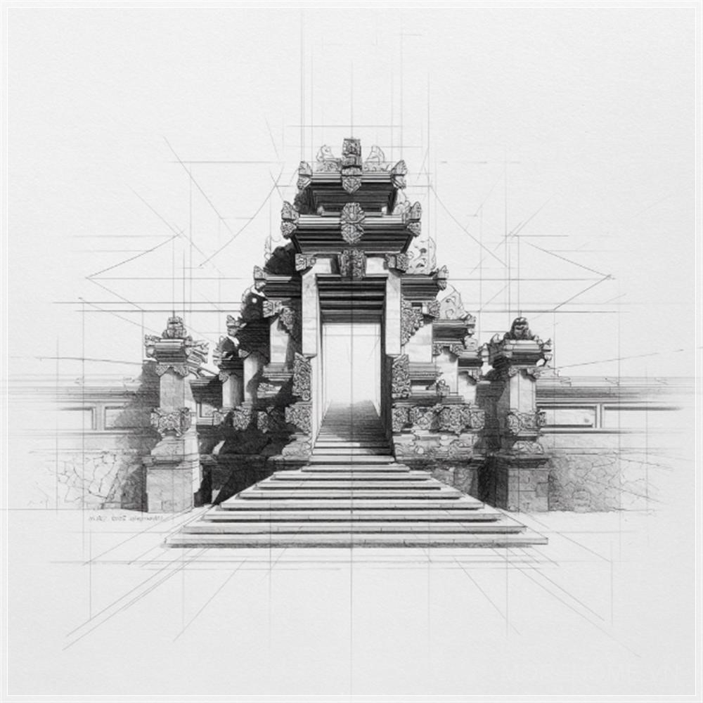 Bức phác thảo bằng bút chì của cổng vào đền Bali, do Malika Favre thực hiện, với nét vẽ chì trên nền trắng. Thiết kế kiến trúc của cổng đền được thể hiện qua các đường nét chì tinh tế, làm nổi bật sự kết hợp giữa sự giản dị và vẻ đẹp truyền thống của kiến trúc Bali. Các chi tiết của cổng đền được phác họa rõ ràng và sắc nét, mang đến một cái nhìn sâu sắc vào những yếu tố văn hóa và thẩm mỹ của công trình.