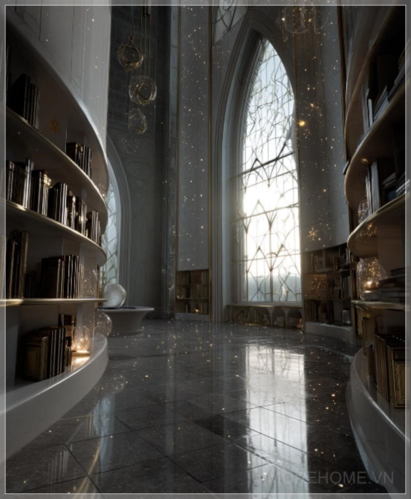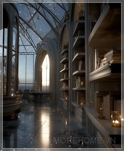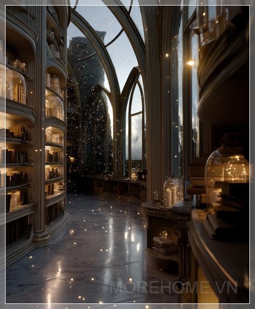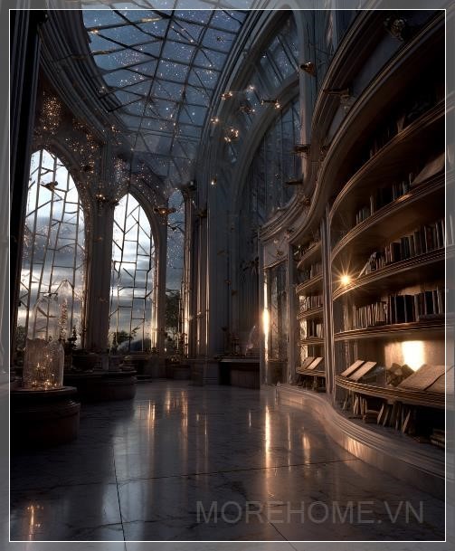 Bức ảnh siêu thực 8K của một thư viện thiên thể bên trong Cung điện Moonstone của Velaris, được tắm mình trong ánh sáng dịu nhẹ của giờ vàng. Một tia nắng duy nhất xuyên qua cửa sổ vòm cao, chiếu vào những hạt bụi lơ lửng như những vì sao treo trong không gian thời gian. Các kệ đá moonstone uốn cong duyên dáng dọc theo các bức tường, chứa những cuốn sách cổ được khắc họa các chòm sao và những ký tự huyền bí. Sàn đá cẩm thạch phản chiếu những tia sáng nhẹ và bóng râm mềm mại. Không có ánh sáng nhân tạo, chỉ có ánh sáng mặt trời đang tàn dần và một ánh sáng mờ ảo, từ những vật phẩm được làm phép. Trên cao, mái vòm kính cao mở ra bầu trời bắt đầu chuyển sang hoàng hôn, với những ngôi sao đầu tiên bắt đầu xuất hiện. Bầu không khí tĩnh lặng, vũ trụ và trang nghiêm, như thể căn phòng tự nhớ lại những vì sao. Chủ nghĩa hiện thực lãng mạn, chiều sâu trường ảnh mơ màng, chi tiết vũ trụ, được ghi lại bởi một nhiếp ảnh gia tưởng tượng ở ranh giới giữa ngày và đêm.
