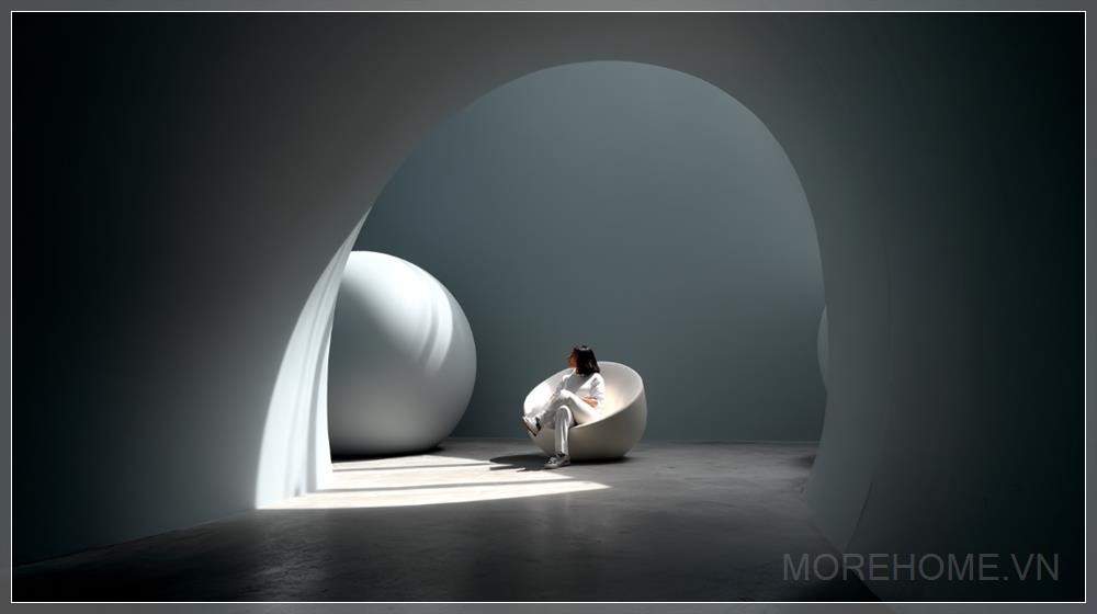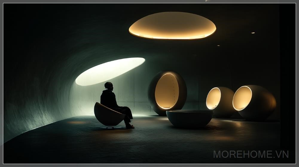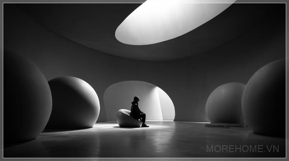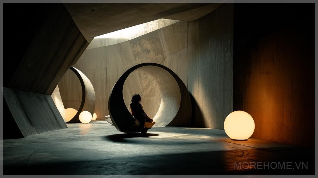 Một căn phòng hình cầu theo phong cách brutalist, đắm chìm trong ánh sáng mờ tối, với kiến trúc nội thất mang phong cách của Zaha Hadid. Một người đang ngồi ở trung tâm, được chiếu sáng bởi những ánh sáng trừu tượng, ngồi trên chiếc ghế bóng tròn tối giản. Bức ảnh được chụp theo phong cách của nhiếp ảnh gia Roger Deakins, với tạp chí Dwell và ống kính Tamron SP 24-70mm f/2.8, mang đến sự tinh tế trong mỗi chi tiết, tạo nên không gian đầy cảm hứng và hiện đại.