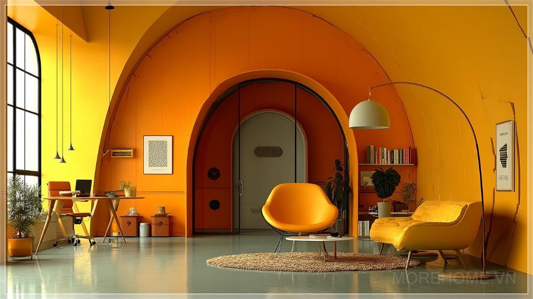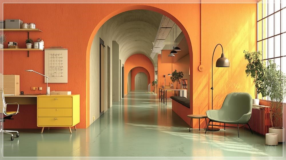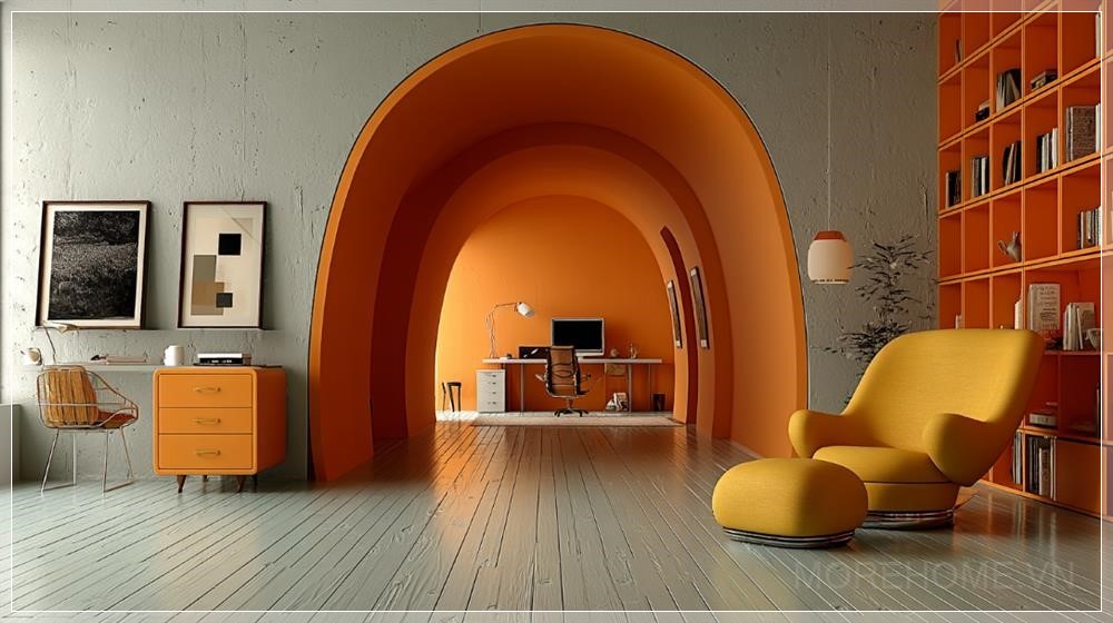 Một góc nhìn kỳ lạ, với một văn phòng đẹp mắt có bức tường màu cam làm nền, được tạo ra theo phong cách hoạt hình, như thể từ một bộ phim 3D Pixar. Không gian được thiết kế với các chi tiết ngộ nghĩnh, màu sắc tươi sáng và những hình khối đơn giản nhưng đầy sức sống. Các món đồ nội thất như bàn, ghế và kệ sách đều có thiết kế mềm mại, đầy màu sắc, tạo nên một không gian làm việc thú vị và vui nhộn. Tất cả đều mang đậm phong cách hoạt hình, tạo cảm giác vui tươi và dễ chịu.