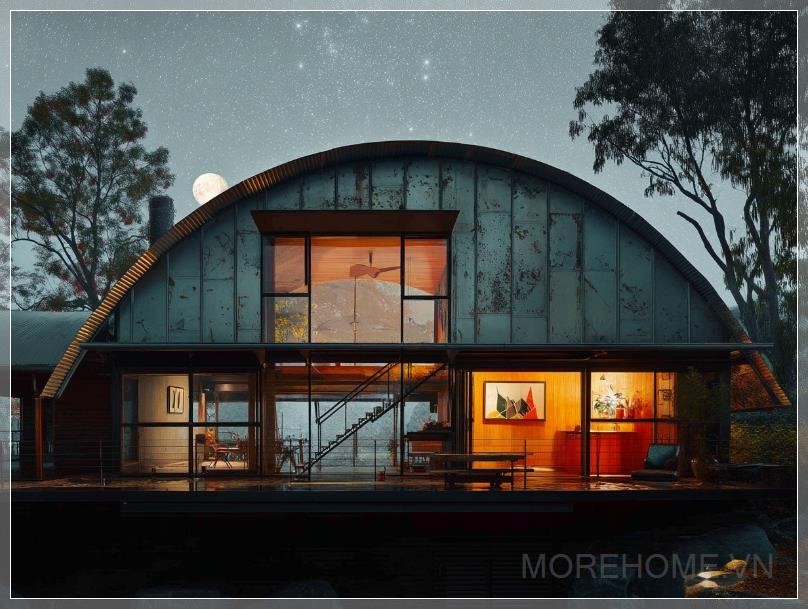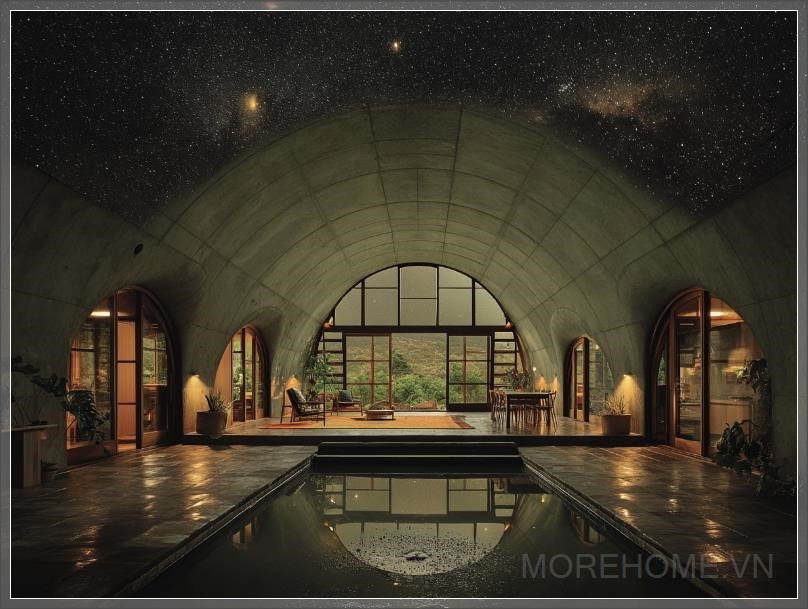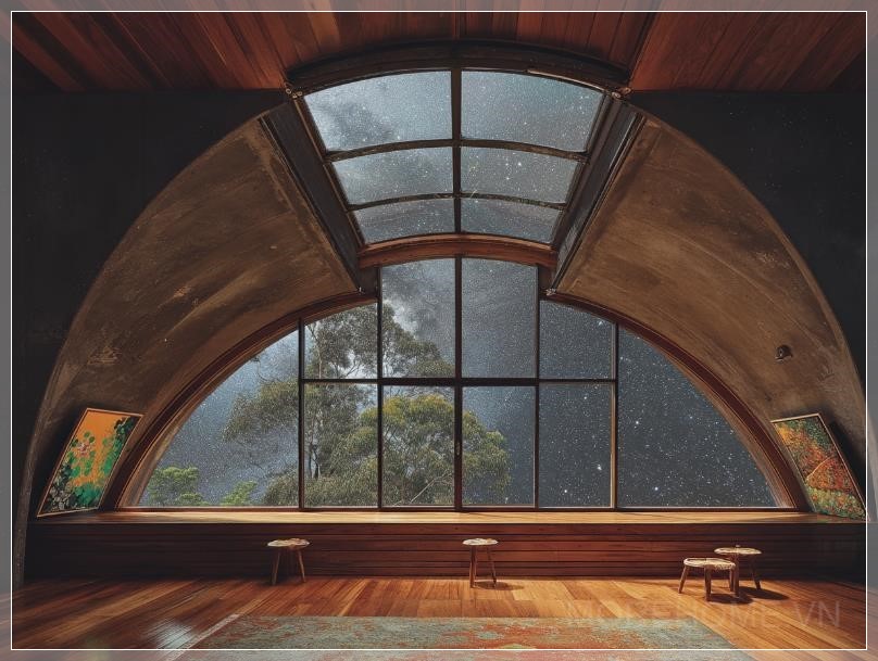 Ngôi nhà Bầu Trời Ban Đêm, được thiết kế bởi Peter Stutchbury, là một kỳ quan kiến trúc kết hợp sự quyến rũ cổ điển với đổi mới hiện đại. Với trần vòm parabol đặc biệt, ngôi nhà mang lại một không gian sống độc đáo và ấn tượng. Cửa sổ trời hình elip có thể thu lại ở trung tâm, mở ra tầm nhìn tuyệt đẹp về bầu trời sao đêm. Thiết kế này không chỉ tạo ra vẻ đẹp thẩm mỹ mà còn giúp kết nối con người với thiên nhiên, mang đến một không gian sống hòa hợp và đầy cảm hứng.