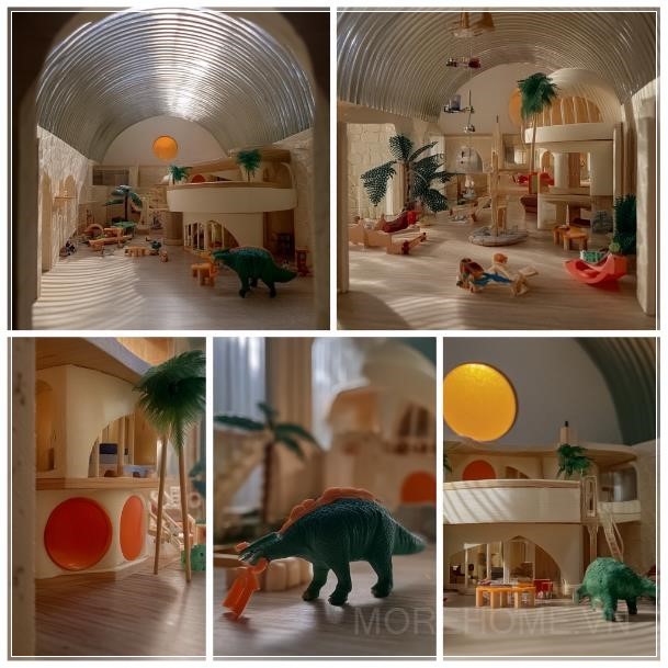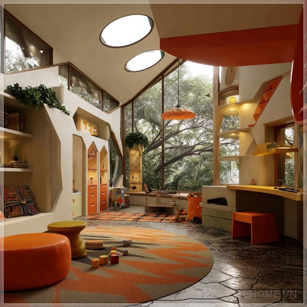 Không gian nội thất của một ngôi nhà chơi theo phong cách một điểm nhìn, kết hợp kiến trúc hữu cơ và phong cách nội thất đầy sáng tạo. Lấy cảm hứng từ Santiago Calatrava, không gian này sử dụng vật liệu Stucco-Wood và kính, mang lại sự kết hợp giữa sự ấm áp của gỗ và tính hiện đại của kính trong suốt. Không gian được trang trí với nhiều đồ chơi, tạo sự vui tươi và năng động cho các em nhỏ.