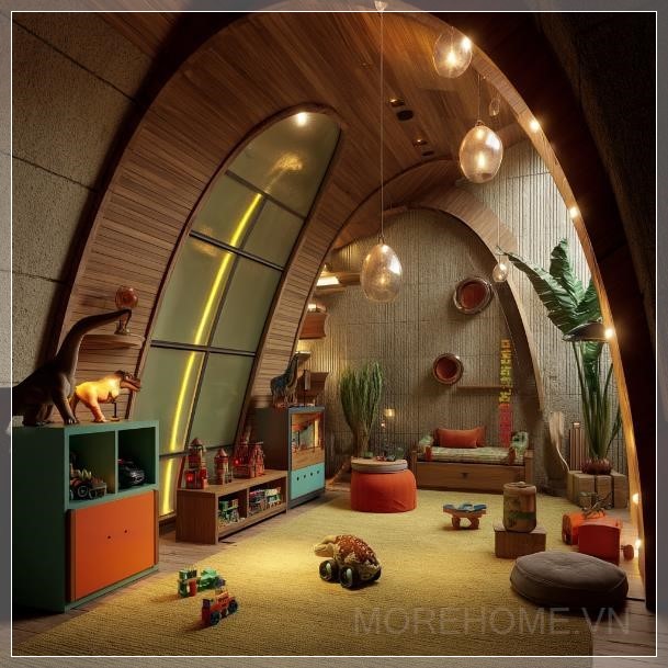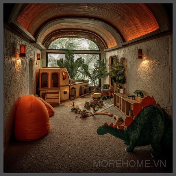Ánh sáng chiếu sáng từ các đèn accent màu sắc sặc sỡ tạo ra một không khí vui nhộn và sống động, với chủ đề Jurassic Park khiến không gian thêm phần thú vị. Những gam màu tươi sáng như xanh lá và cam tạo nên sự tươi mới, kết hợp với các cửa sổ không trần cho phép ánh sáng tự nhiên tràn vào, làm cho không gian trở nên rộng rãi và thoáng đãng. Các yếu tố trang trí như cây xanh tươi mới và các chi tiết độc đáo mang đến một không gian không chỉ dành cho việc vui chơi mà còn thúc đẩy trí tưởng tượng và sự sáng tạo.