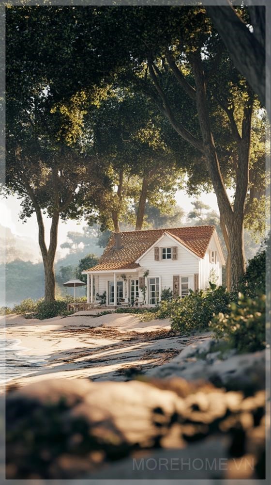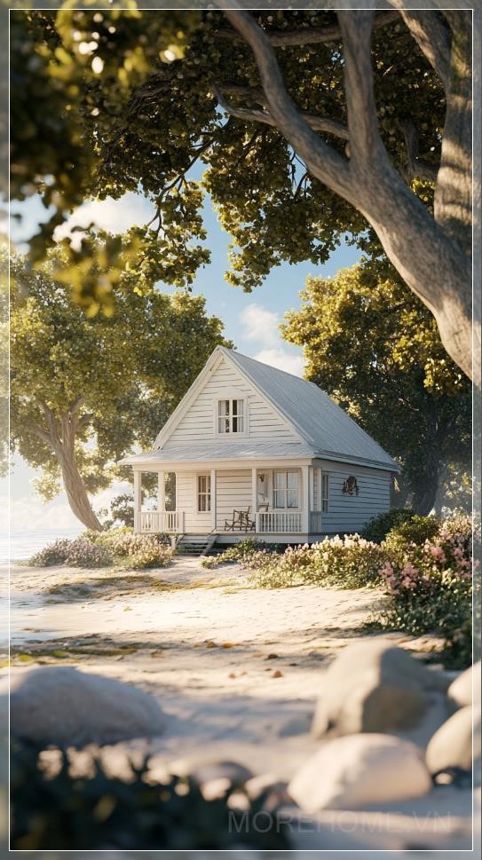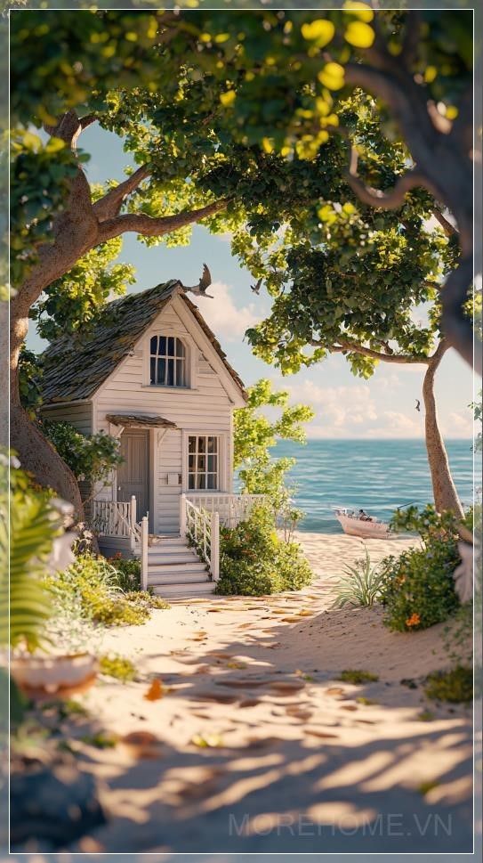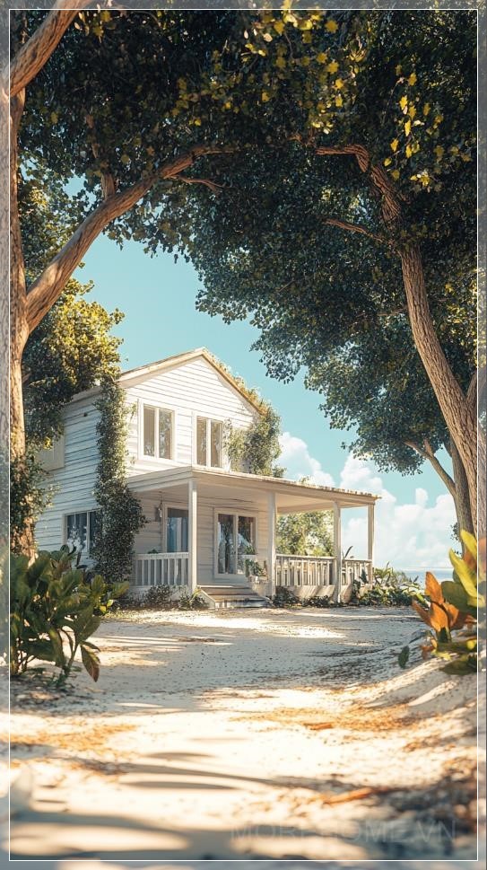 { "prompt": "A white wooden house near the beach hidden under the shade of trees, in a 3D Unity rendering with cartoon shading. The house is surrounded by lush greenery, with sunlight filtering through the trees, casting dappled shadows on the ground. The scene is designed in the style of a movie poster, with high-resolution video game aesthetics, vibrant colors, and a slightly exaggerated, stylized look.",