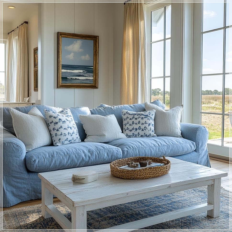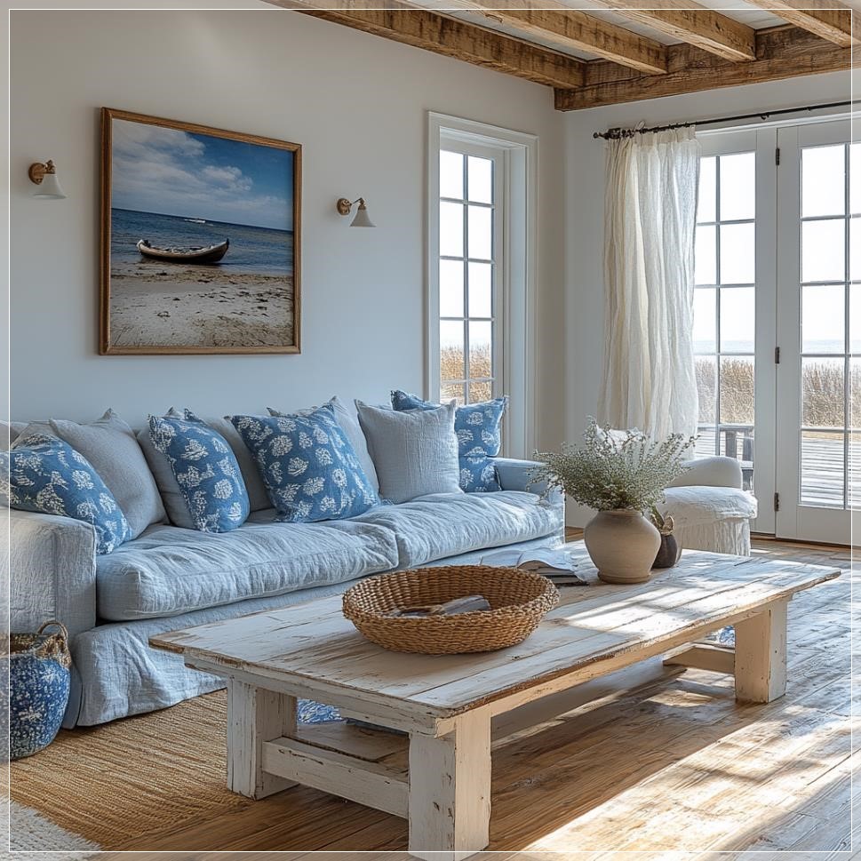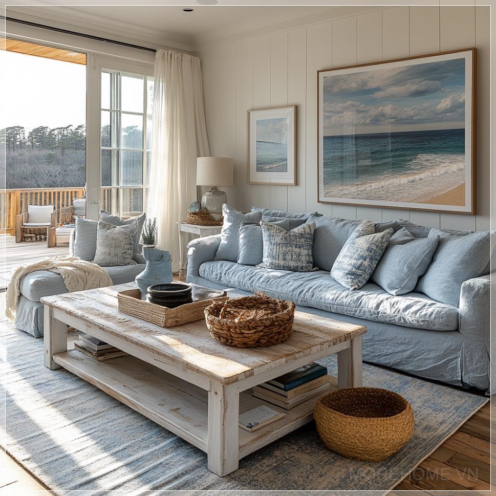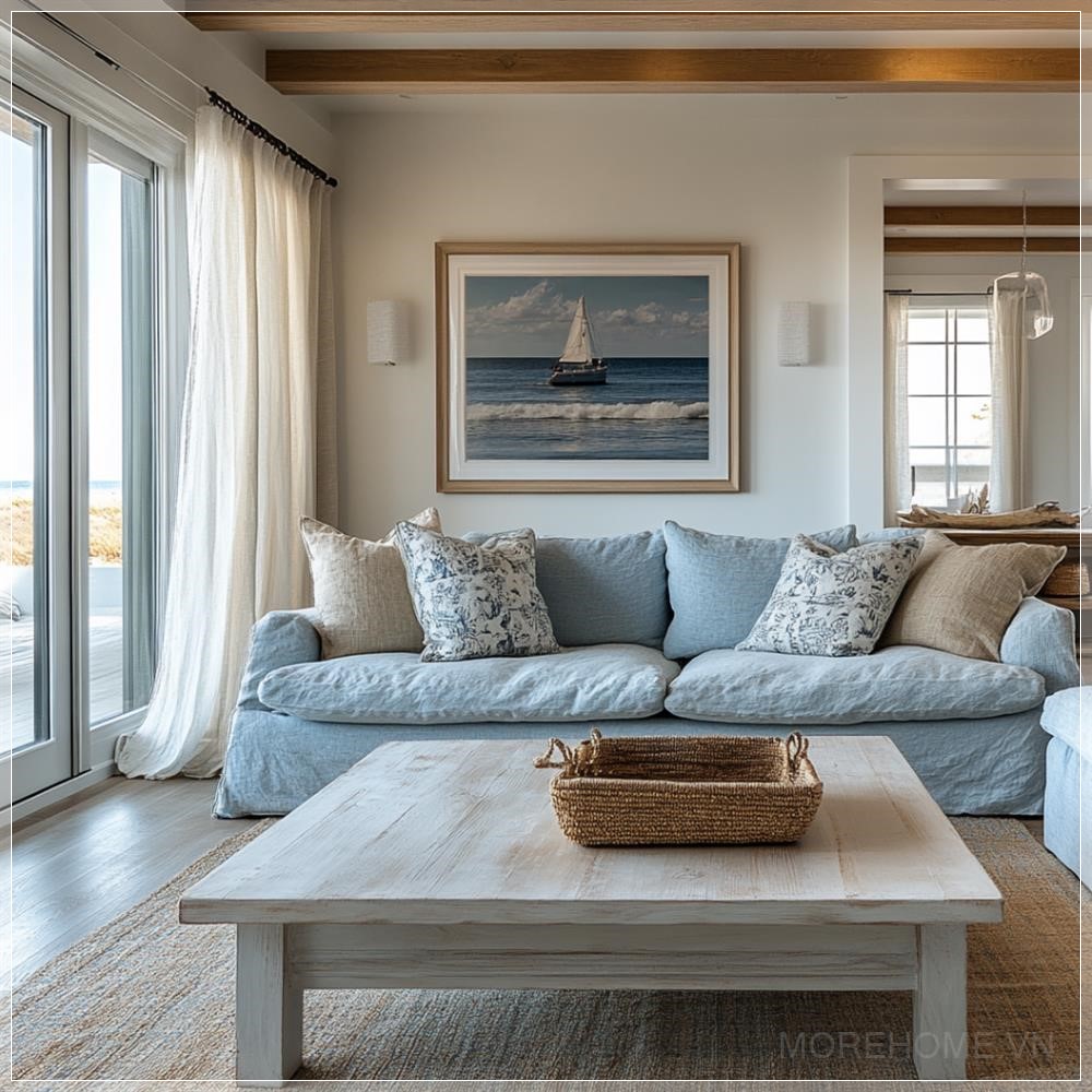 Phòng khách lấy cảm hứng từ phong cách ven biển với những bức tường trắng tinh, nội thất vải lanh màu xanh nhẹ và gối tựa họa tiết hải dương. Bàn cà phê bằng gỗ trắng và sàn gỗ sồi sáng tạo nên vẻ ngoài thoáng đãng, trong khi rèm cửa mỏng nhẹ cho phép ánh sáng tự nhiên tràn ngập không gian. Không gian phòng khách mang lại cảm giác thư giãn, tươi mới, như một khu nghỉ dưỡng ven biển, với sự kết hợp hài hòa giữa các chi tiết tự nhiên và thiết kế tối giản, tạo nên một không gian sống nhẹ nhàng và dễ chịu.