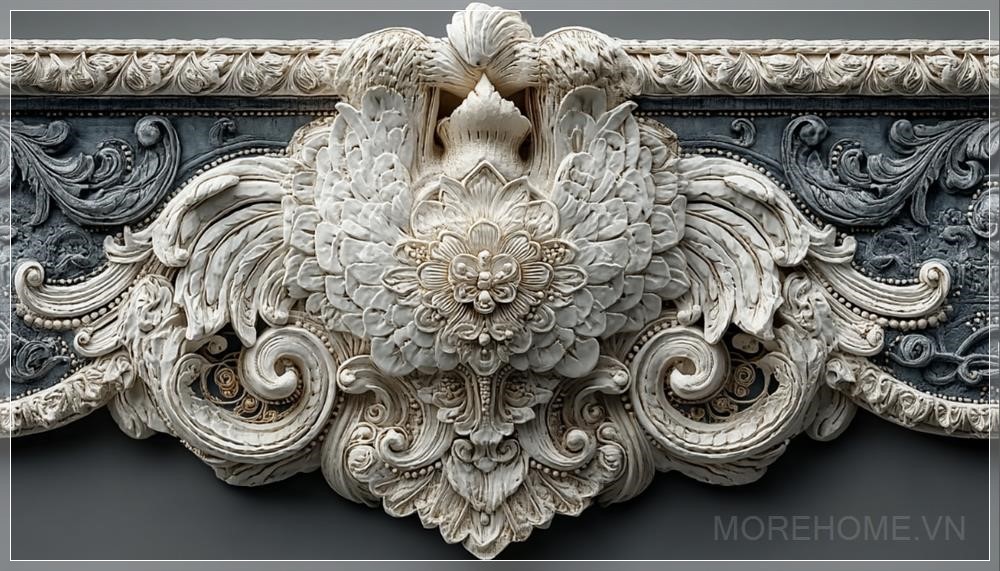 Nền xám trung tính làm nổi bật sắc trắng tinh khôi của thạch cao, khiến từng chi tiết uốn lượn thanh thoát càng thêm rõ nét. Các đường cong mượt mà, hoa văn lượn sóng và những chi tiết đan xen tinh tế tạo nên một tổng thể thanh lịch, trang nhã, giàu cảm xúc thủ công.