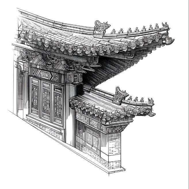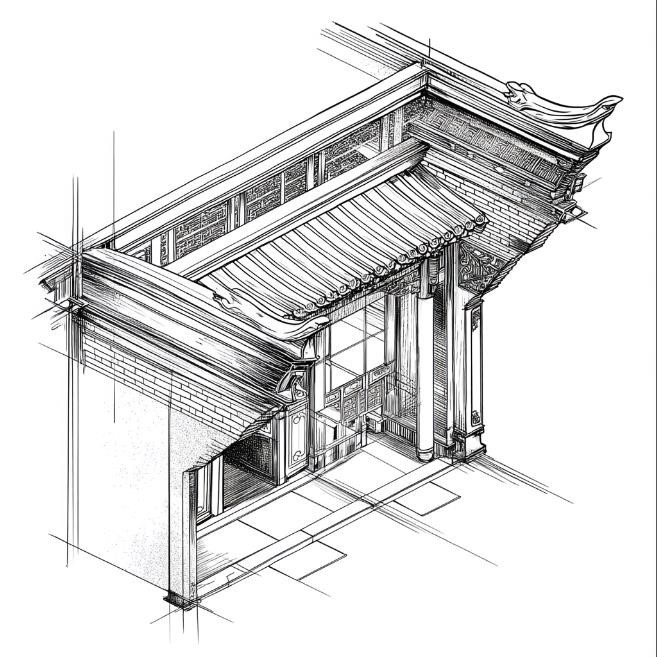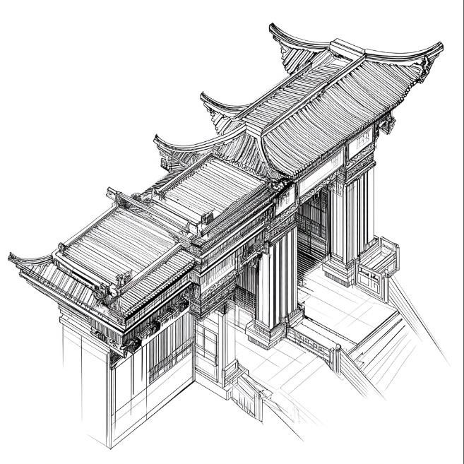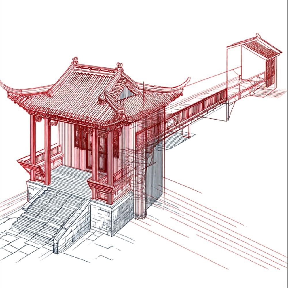 Bản vẽ đường nét isometric tinh xảo thể hiện mái hiên truyền thống Trung Hoa, được cách điệu với các đường cong uyển chuyển và chi tiết trang trí tinh tế. Mái hiên được cô lập hoàn toàn trên nền trắng, làm nổi bật từng đường viền sắc nét và cấu trúc đặc trưng như các góc uốn cong, đỉnh mái vươn cao và lớp ngói xếp chồng. Các chi tiết nhỏ như hoa văn rồng, mây lượn, và viền mái lượn sóng được thể hiện bằng các đường kẻ đơn giản nhưng cực kỳ chính xác. Toàn bộ tác phẩm được thực hiện ở độ phân giải 4K, mang lại độ sắc nét cao và cảm giác thuần khiết, thanh thoát, tôn vinh vẻ đẹp kiến trúc cổ điển Trung Hoa trong một phong cách đồ họa tối giản hiện đại.