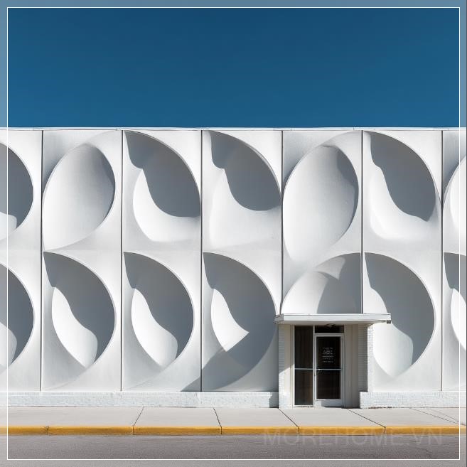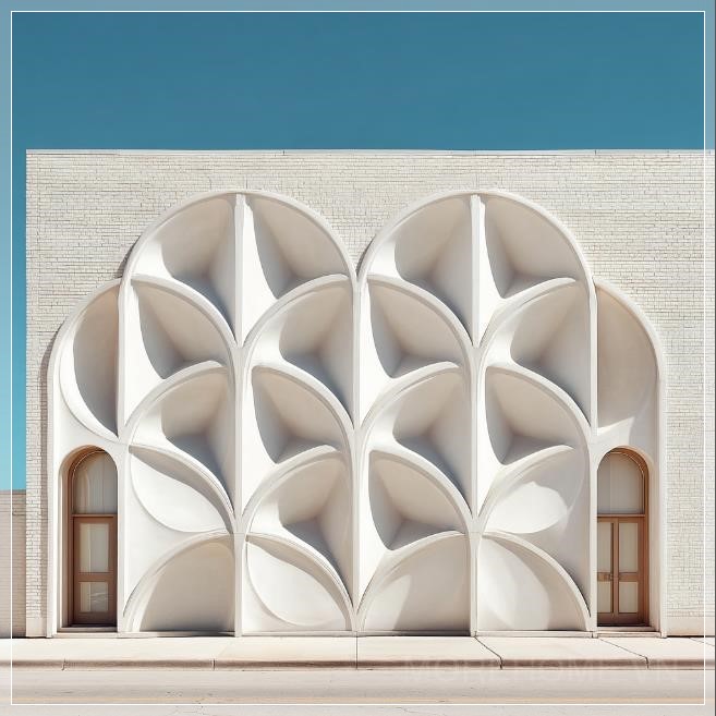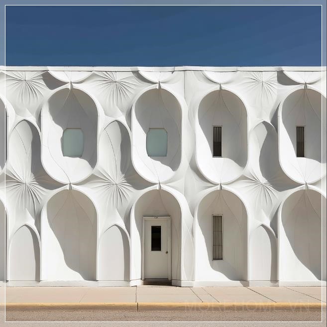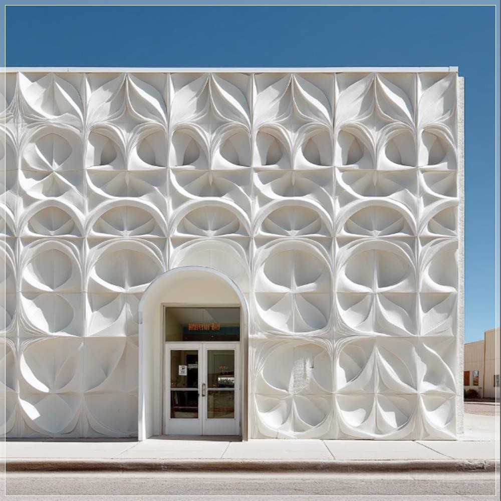 Một bức tường mặt tiền bằng đất sét trắng với họa tiết tham số, kết hợp giữa các vòm cong và cánh hoa, tạo nên một bố cục kiến trúc đối xứng hoàn hảo. Công trình tọa lạc tại Marfa, Texas, nổi bật giữa không gian với vẻ đẹp tinh tế và hình khối mềm mại. Bức ảnh kiến trúc được chụp với kỹ thuật chuyên nghiệp, làm nổi bật kết cấu mịn màng của đất sét trắng cùng những đường nét uốn lượn nhịp nhàng, đậm chất nghệ thuật đương đại giữa khung cảnh yên bình của Marfa.