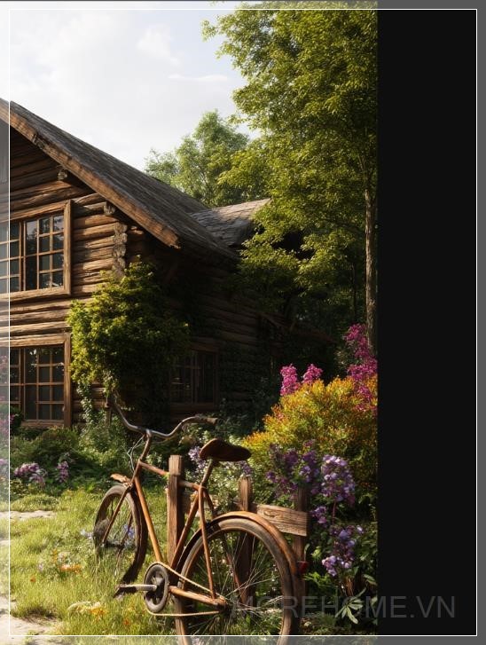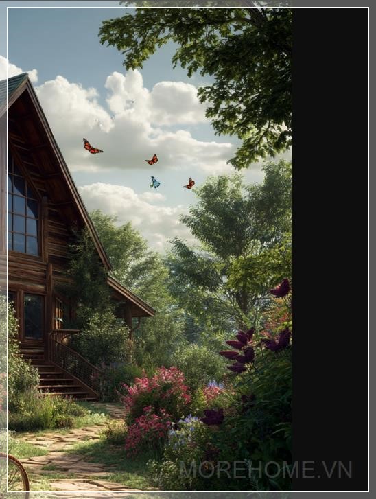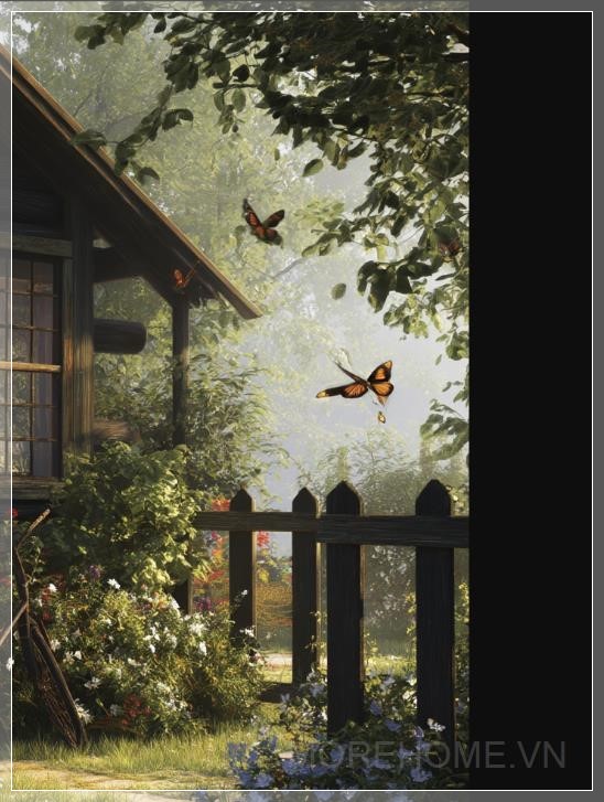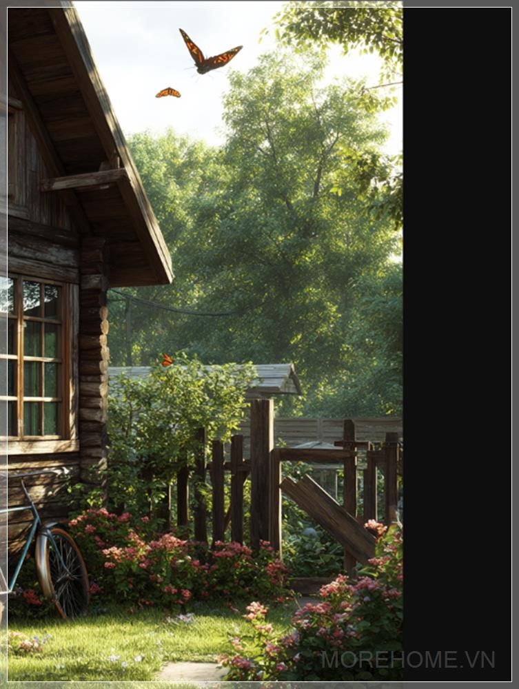 Bên cạnh ngôi nhà, một hàng rào gỗ cũ kỹ được phủ lớp rêu xanh, tạo cảm giác hoài cổ, nơi một chiếc xe đạp cũ đã im lìm tựa vào đó, như thể chờ đợi ai đó quay lại. Những chú chim bay lượn trên không trung, thỉnh thoảng dừng lại trên các cành cây, tạo nên một bức tranh sống động. Những con bướm màu sắc rực rỡ bay lượn quanh khu vườn, như tô điểm thêm cho vẻ đẹp bình yên của cảnh vật.