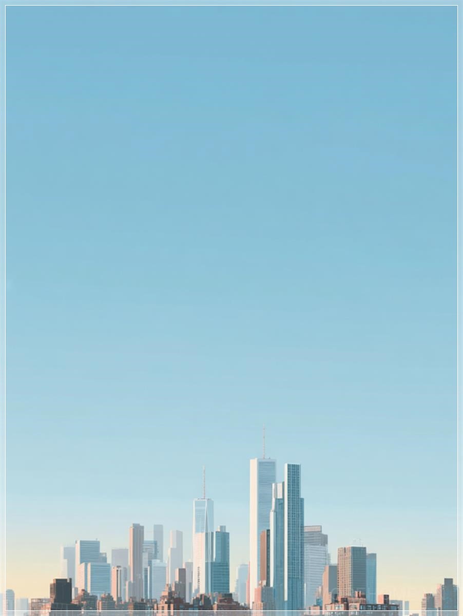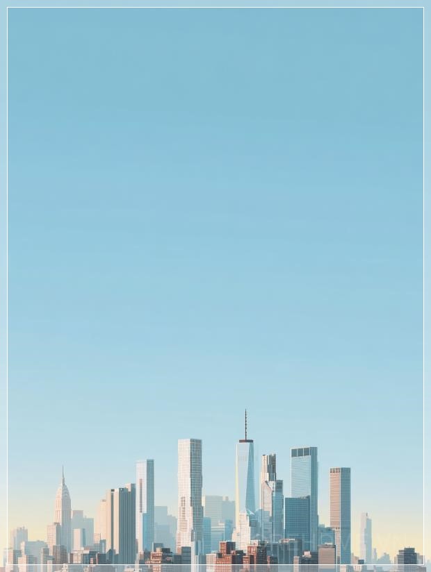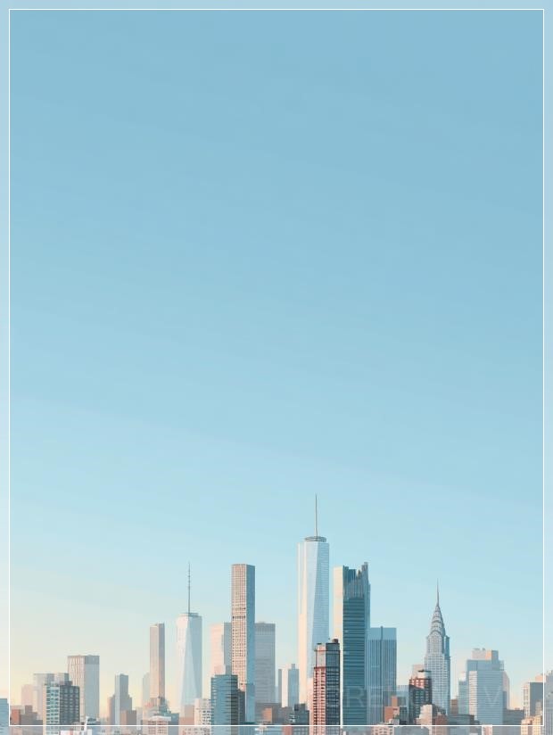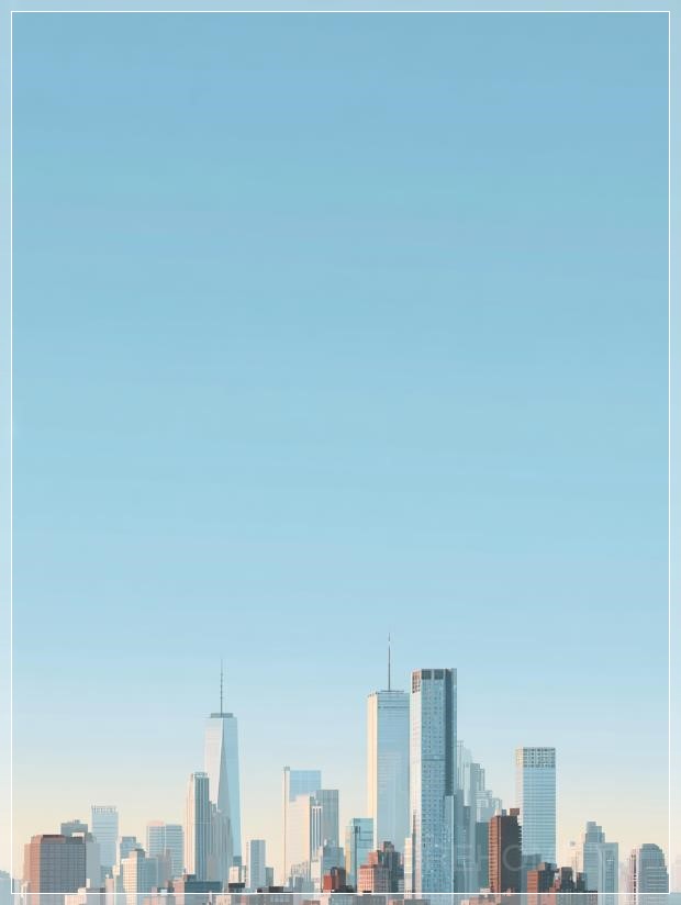 Với bầu trời xanh nhẹ nhàng và những gam màu vàng mềm mại gần chân trời, khung cảnh của New York hiện lên trong một vẻ đẹp thanh thoát và tinh tế. Các tòa nhà cao tầng vươn lên, với đường nét kiến trúc sắc nét, tạo thành những hình bóng rõ rệt ở phía dưới khung hình. Ánh sáng mạnh mẽ tắm sáng các cấu trúc, làm nổi bật những chi tiết sắc sảo và tạo nên những bóng râm nhẹ nhàng, làm tăng chiều sâu cho không gian.