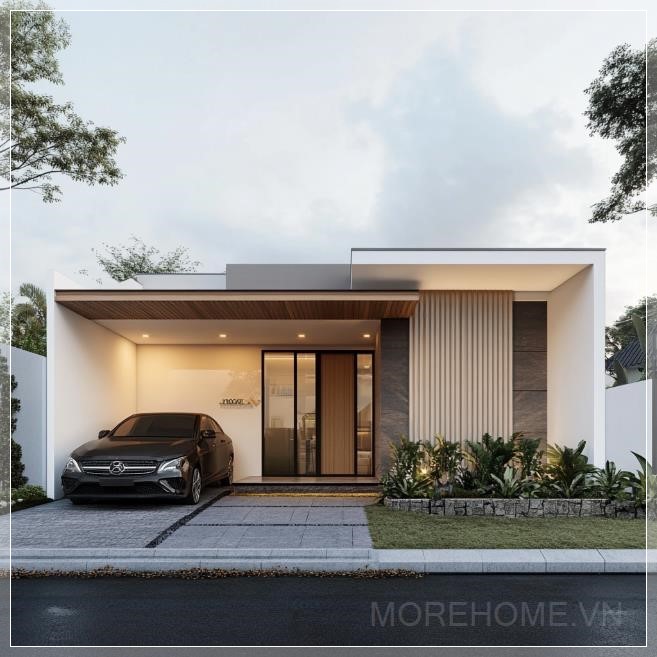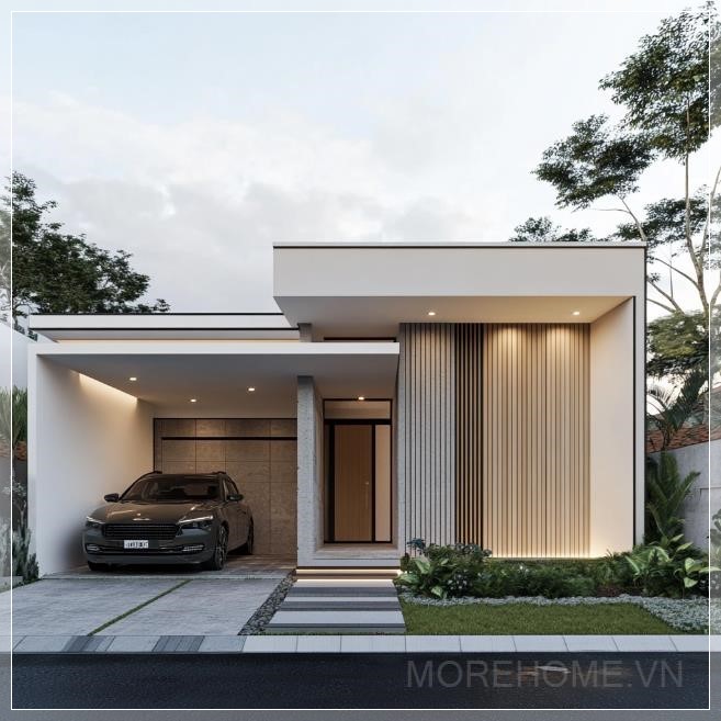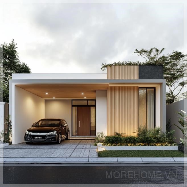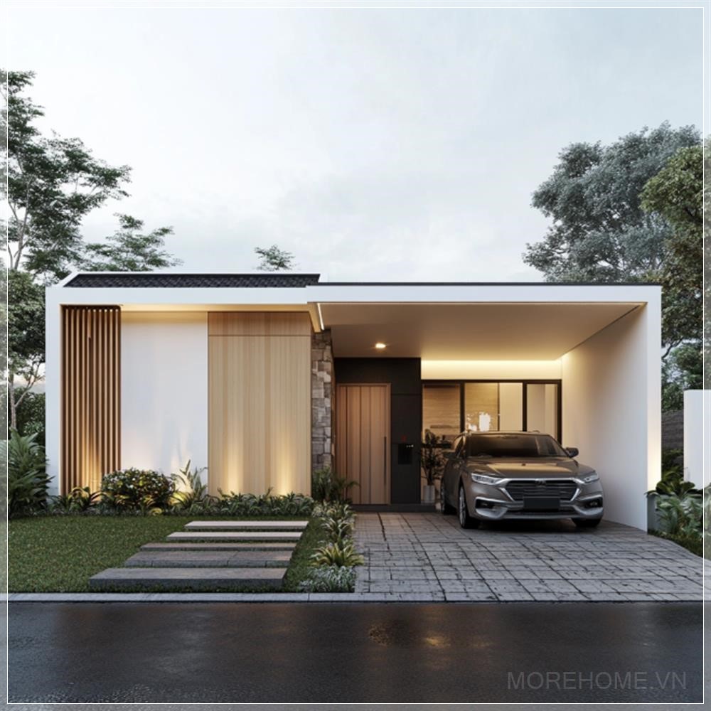 Với một phối màu nhẹ nhàng giữa trắng và gỗ tự nhiên, căn nhà một tầng này mang đến một không gian sống tinh tế và thanh thoát. Mặt tiền của ngôi nhà được thiết kế đơn giản, nhưng đầy sức hút, với cổng chính thanh lịch và khu vực sân đỗ xe rộng rãi. Vách tường của ngôi nhà tạo điểm nhấn với một cửa sổ lớn phía trên cửa ra vào, không chỉ giúp không gian trở nên sáng sủa mà còn làm nổi bật vẻ đẹp tối giản của toàn bộ công trình.