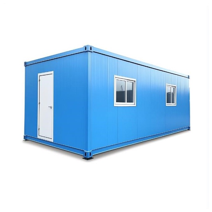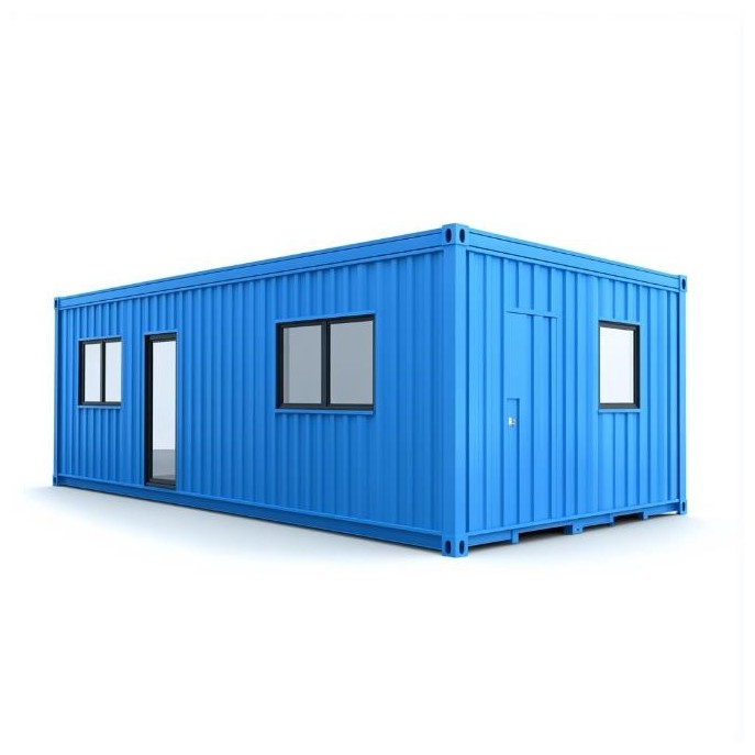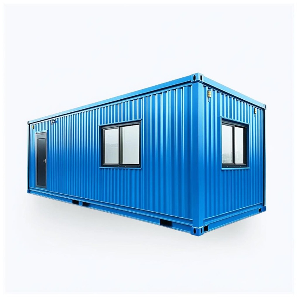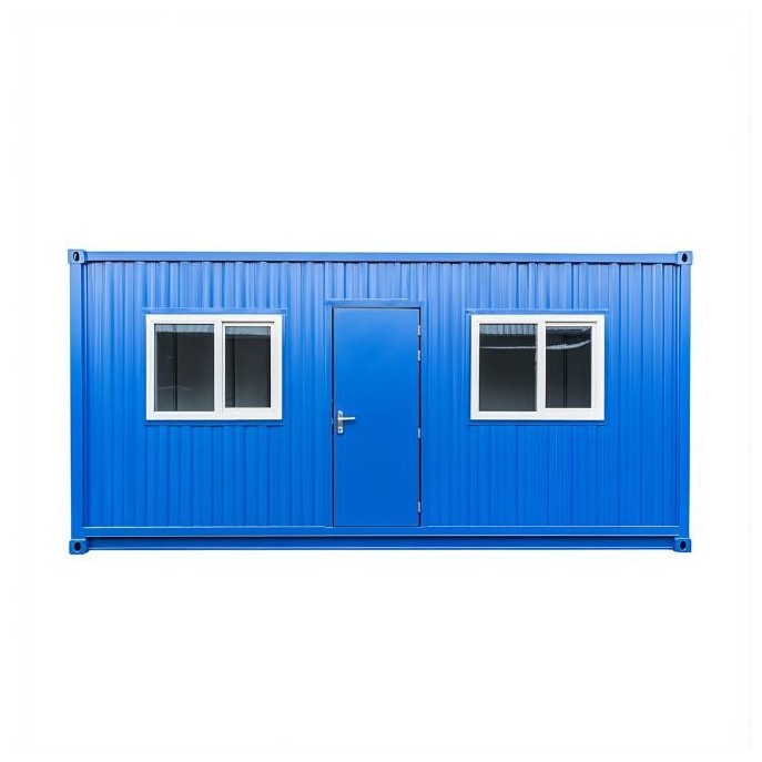 A simple blue rectangular container with a white background. It has windows and doors on the left side of two walls, and one window in the front for decoration. The view is flat and frontal, with no floor inside. The structure is a steel frame with exterior wall paneling material, used as a container box or tent for a store, office, or working space.