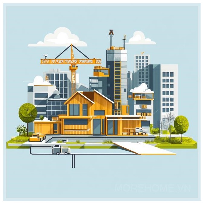 Hình ảnh này sẽ mang đậm phong cách thiết kế phẳng (flat design), một xu hướng hiện đại với những đường nét đơn giản nhưng đầy sức mạnh. Màu sắc chủ đạo sẽ là những tông màu tự nhiên như xanh lá cây, xám và nâu để phản ánh tính bền vững và gần gũi với thiên nhiên. Những hình khối rõ ràng và sắc nét, không có quá nhiều chi tiết phức tạp, sẽ làm nổi bật các yếu tố chính của mô-đun xây dựng - các khối nhà được lắp ráp dễ dàng và nhanh chóng, với các chi tiết nhẹ nhàng nhưng vẫn rất chắc chắn và hiện đại.