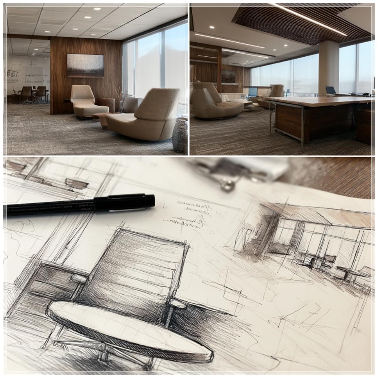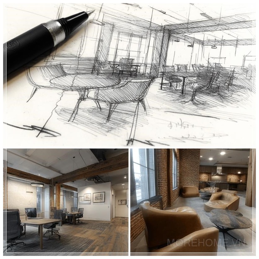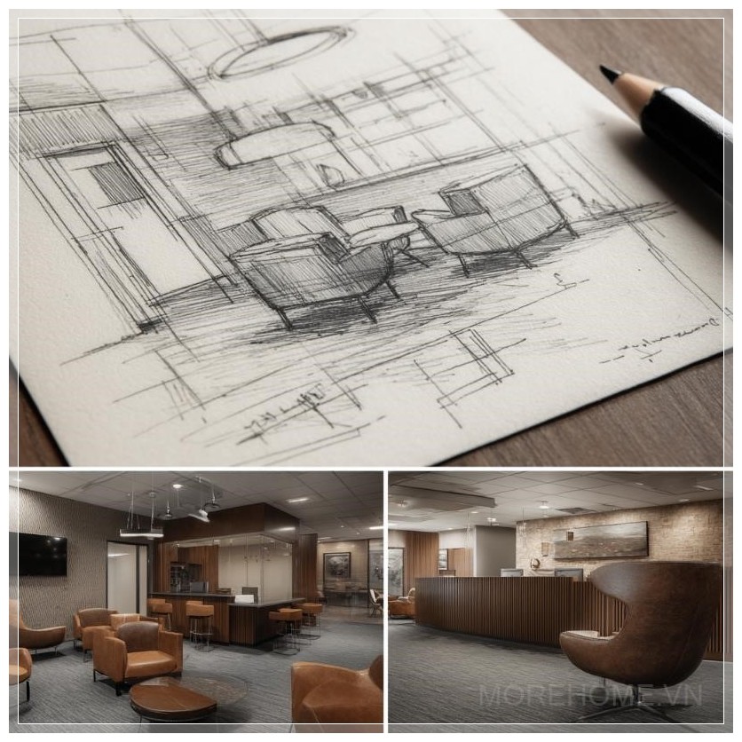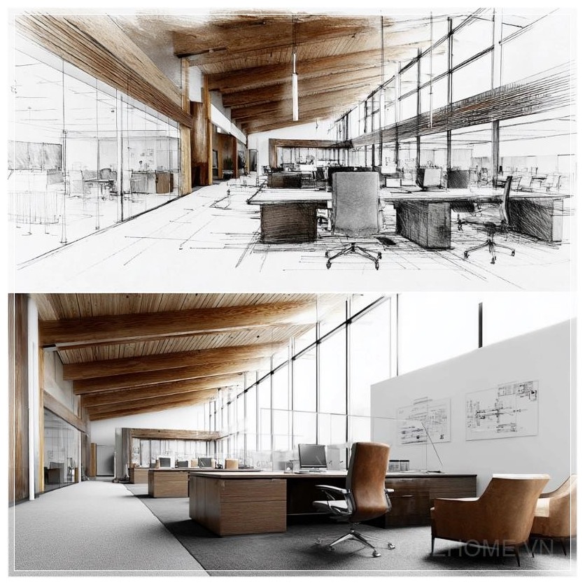 Những bản phác thảo kiến trúc chi tiết dần dần trở thành hiện thực, mang lại không gian văn phòng hiện đại đầy ấn tượng. Sự chuyển mình từ những nét vẽ sơ khai đến một môi trường làm việc đầy cảm hứng là minh chứng rõ ràng cho sự sáng tạo không ngừng trong thiết kế nội thất. Những đường nét tinh tế của các bản phác thảo không chỉ được thể hiện qua các chi tiết hình học mà còn qua từng vật dụng và chất liệu trong không gian.
