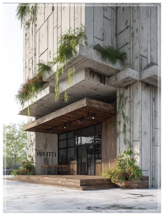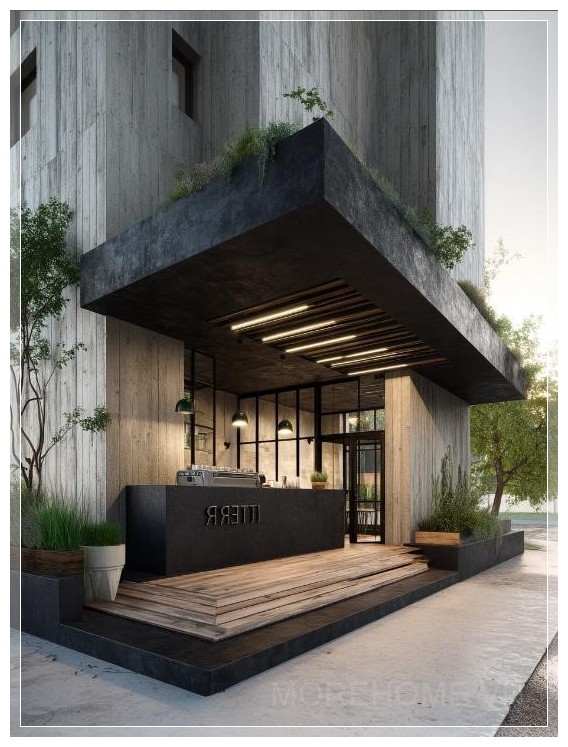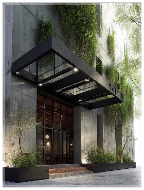 Với thiết kế giành giải Architizer A+ Award, mặt tiền của quán cafe Brutalist Organic là một tác phẩm nghệ thuật kiến trúc độc đáo, kết hợp hoàn hảo giữa sự thô mộc của bê tông và vẻ đẹp tự nhiên của cây cối. Bức tường bê tông thô với những rãnh trồng cây dọc theo mặt tiền không chỉ tạo nên một khung cảnh ấn tượng mà còn làm tăng vẻ đẹp tự nhiên của không gian.