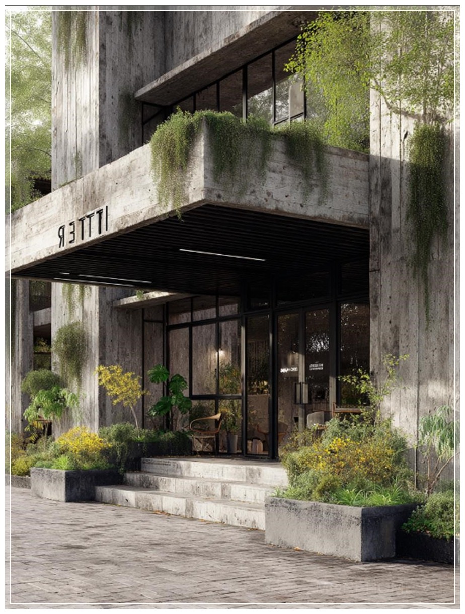 Brutalist Organic cafe facade, Architizer A+ Award-winning design, photorealistic architectural rendering with hyper-real material textures, raw concrete facade with vertical planting grooves, extended reclaimed teak decking from interior, frontal composition with signage'ITER' cast into blackened steel portal, cantilevered concrete awning with integrated grow lights --ar 3:4 --v 7.0